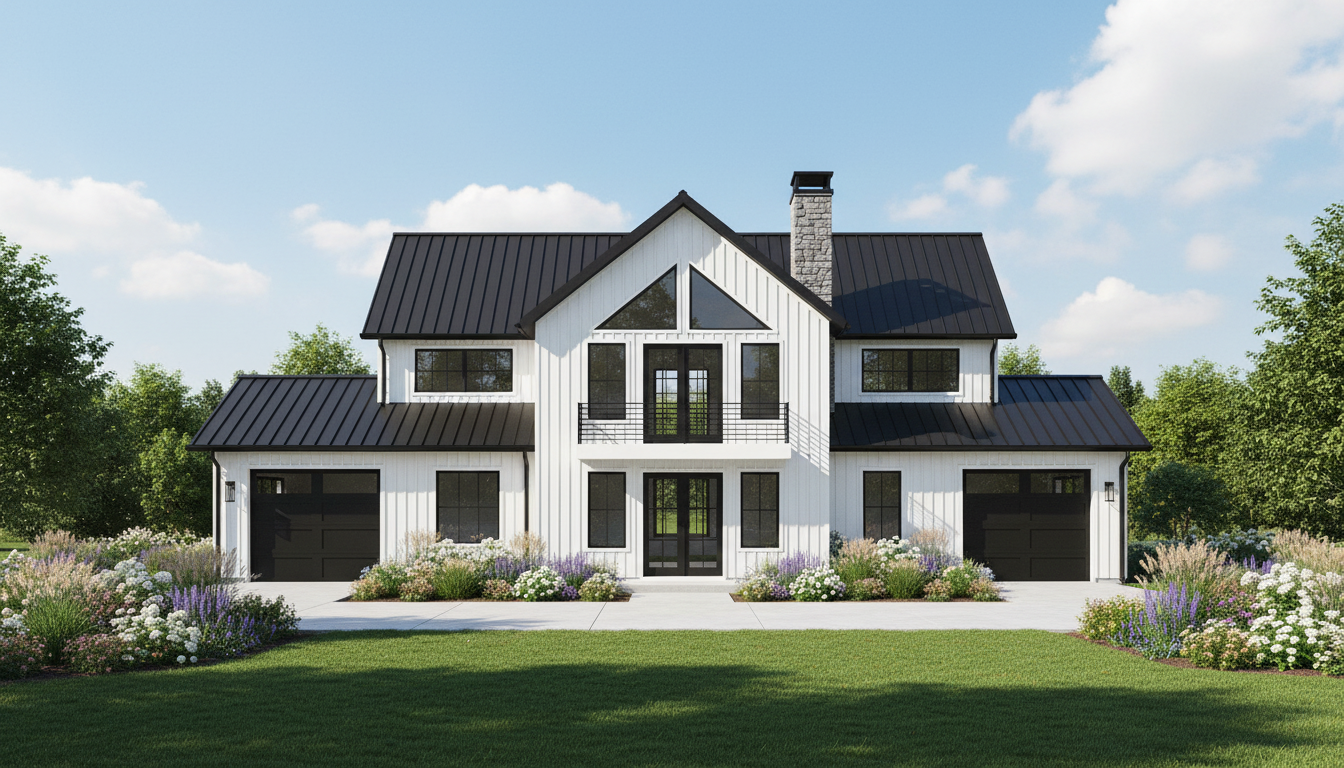 board and battin white black windows black roof black garage doors monitor style barn garages in lean toos take out gables on side inset from doors and windows for 2 story covered patio take out covering over front door