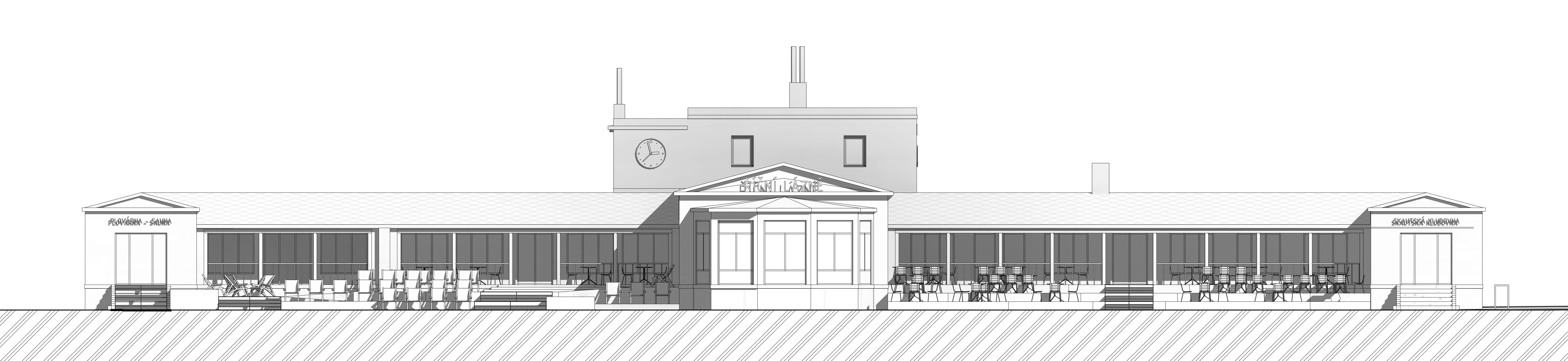 the house is from the 1930 and now is newly reconstructed the house has a rocky path and beach in front of it it is a river spa with a forest behind it the roof is made of metal sheets of brick red color most of the walls are in creamy white plaster terraces in front of the building are made of timber the house has a pebble beach in front of it the river is farther away