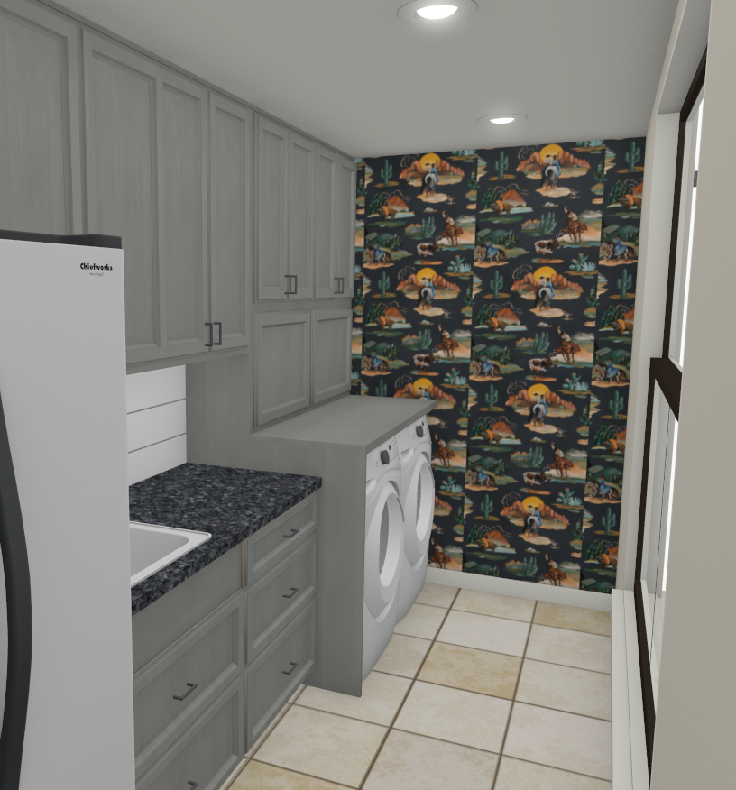 create a beautifully rendered image of a laundry room with a light and airy atmosphere the room features sleek gray cabinets with a subtle matte finish a countertop with a dark textured granite surface complements the cabinets the room s focal point is a vibrant accent wall covered with a desert themed wallpaper showcasing elements like cacti mountains and a colorful sunset incorporating deep green warm orange and muted brown tones light beige ceramic tiles cover the floor harmonizing with the neutral color palette ensure ambient lighting creates a cozy inviting atmosphere with soft shadows and highlights that enhance the textures and colors of the space