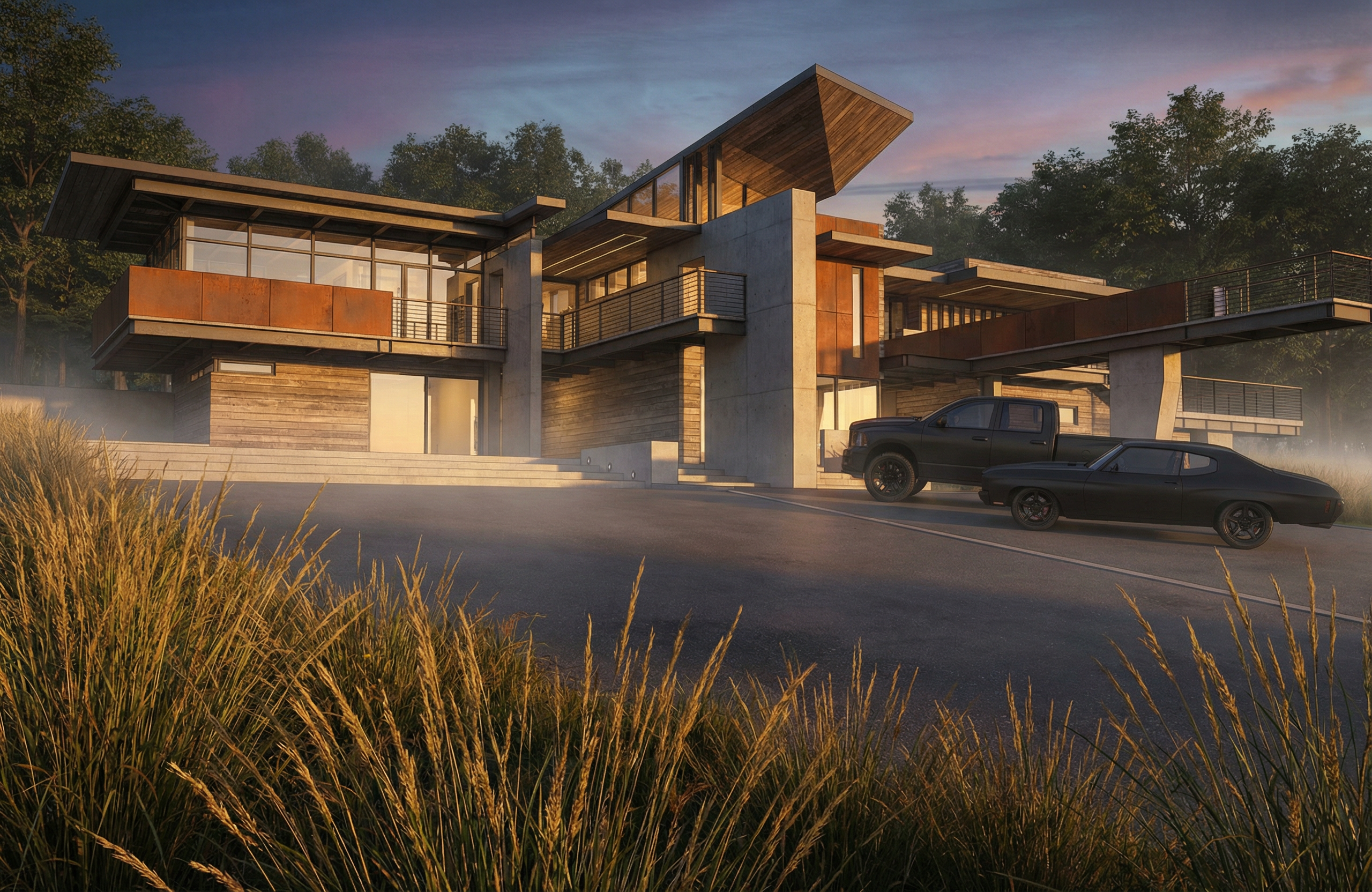 rustic shiplap siding with corten panels concrete accent walls tall grass in foreground trees in background sunlight on building face dusk fog