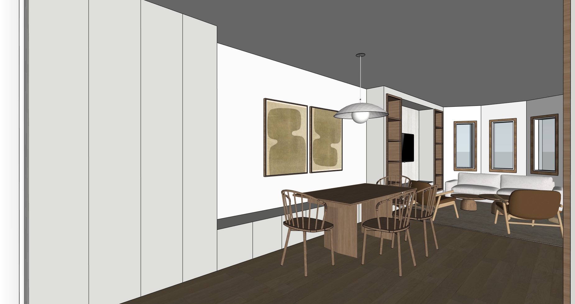 minimalism interior shot a modern minimalistic living and dining space with a cozy atmosphere the room features a white ceiling and rich dark wooden flooring the walls are painted in a soft light cream to complement the natural wooden textures of the dining table and chairs which should be walnut two abstract paintings with muted green earthy tones hang on the wall adding artistic flair the dining area is illuminated by a sleek luminaire pendant contemporary pendant lamp in cream the living space includes a comfortable light gray sofa with plush cushions a small wooden coffee table and elegant wooden accents throughout large windows with reclaimed wooden frames let in natural light creating a warm and inviting ambiance let s keep the cabinetry white where is shown and where wood texture shows make it walnut architecture