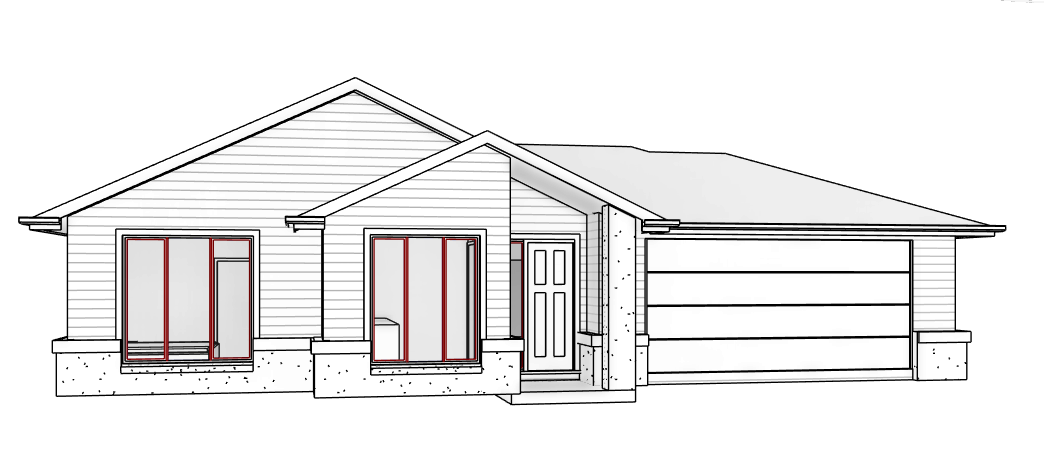 weatherboard cladding to be light grey render to be medium grey roof gutter and window trims to be in white window frames to be black front door to be black