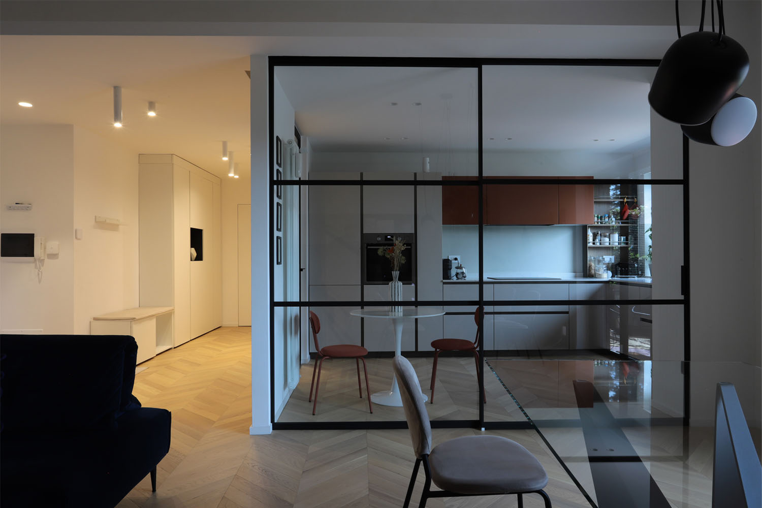 rendi la foto pi larga e inserisci a sinistra un divano di colore bordeaux e a destra una finestra scorrevole con infisso nero