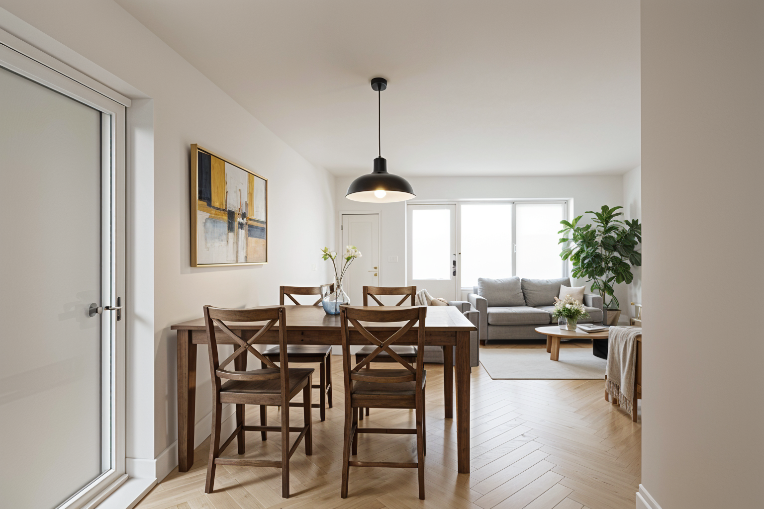 no stairs outside change style to minimalistic hand a lamp above the table add some art and a plant big sofa