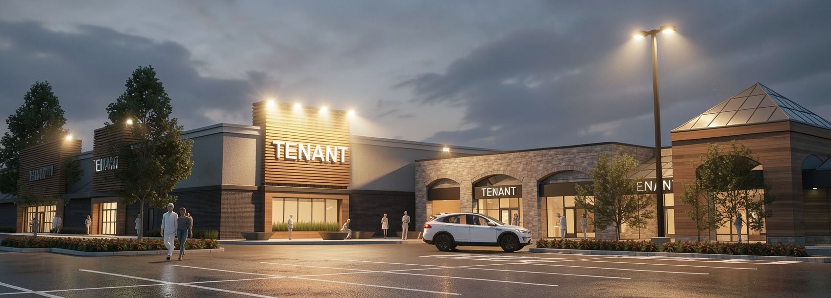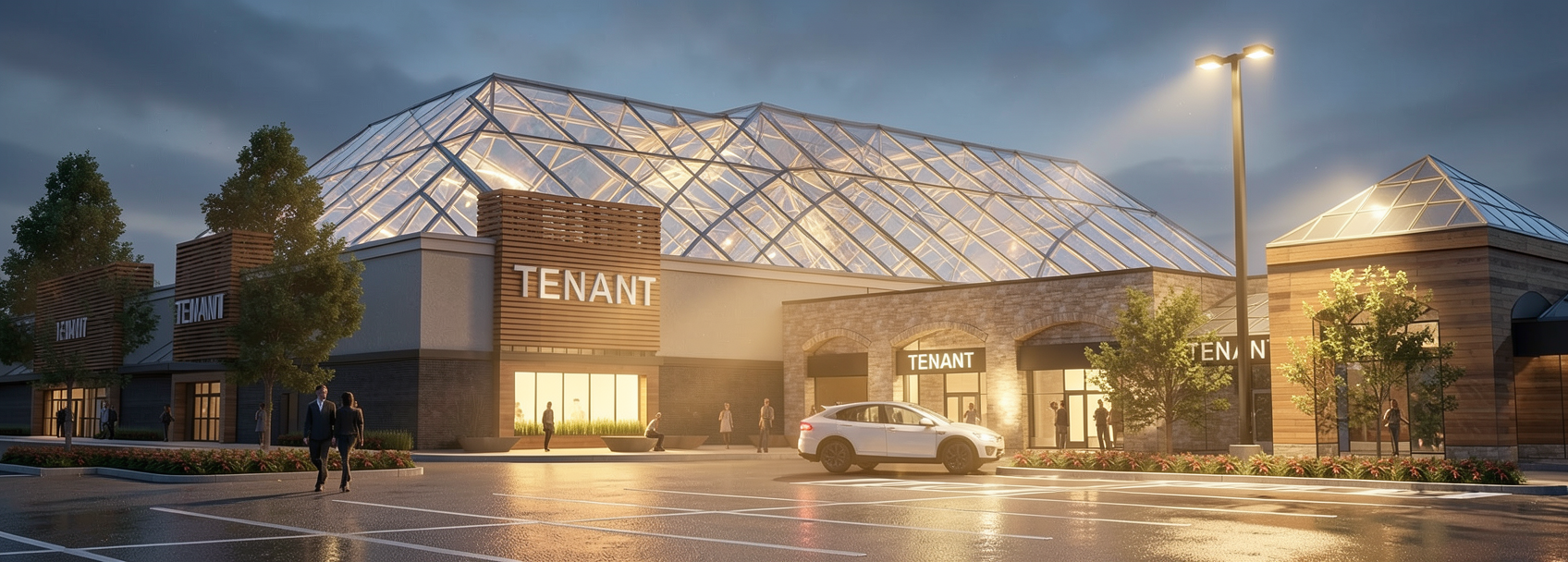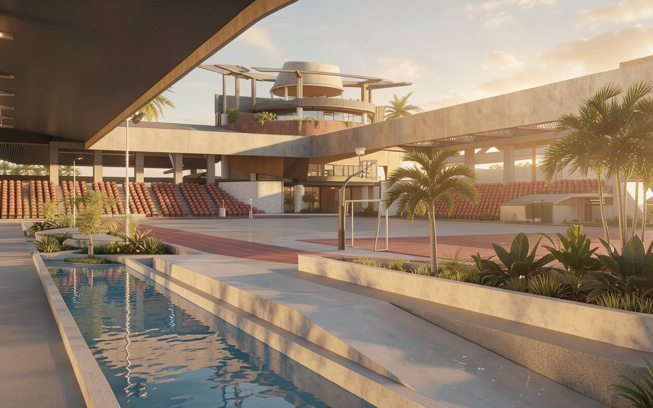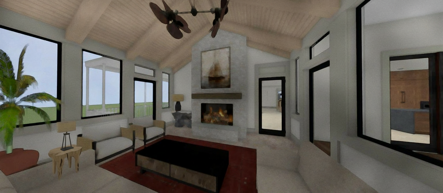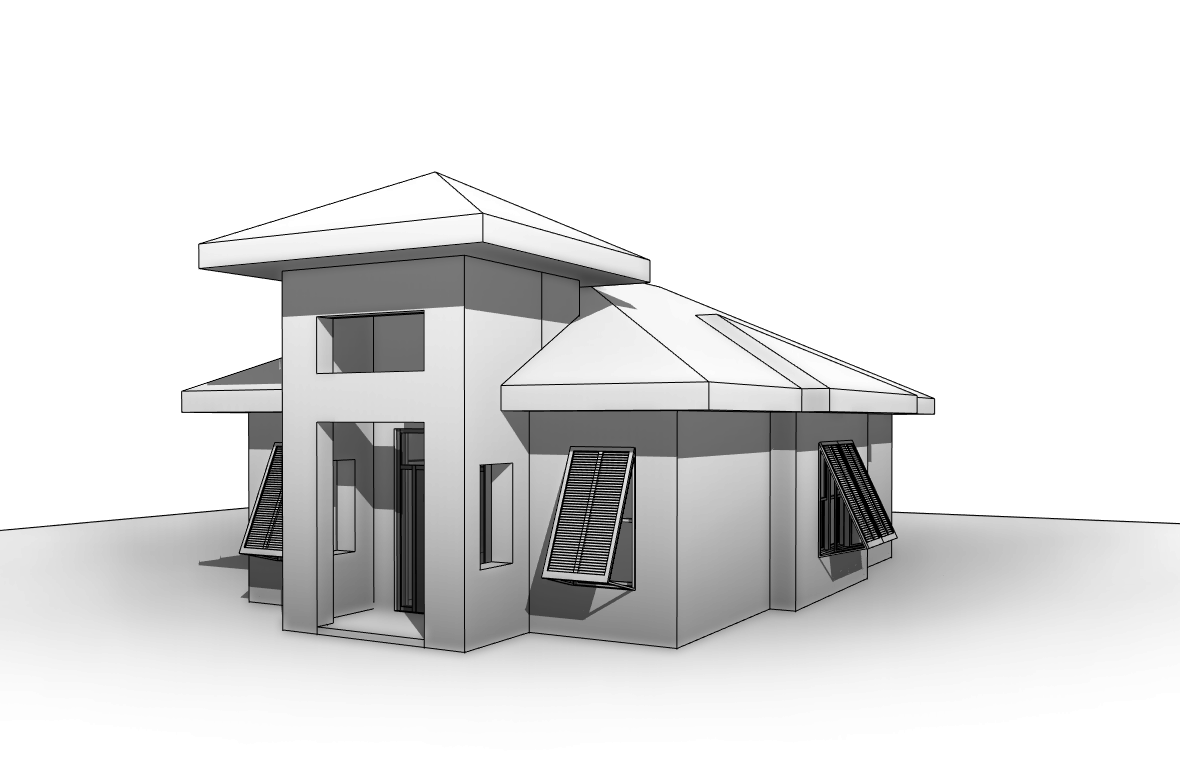 stucco building with gray clay shingles south florida style light green storm shutters for windows with landscaping and palm trees around and a golf course in the background