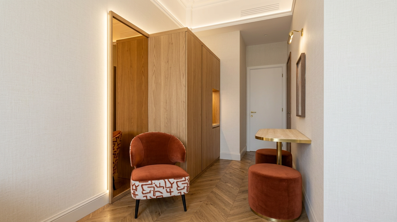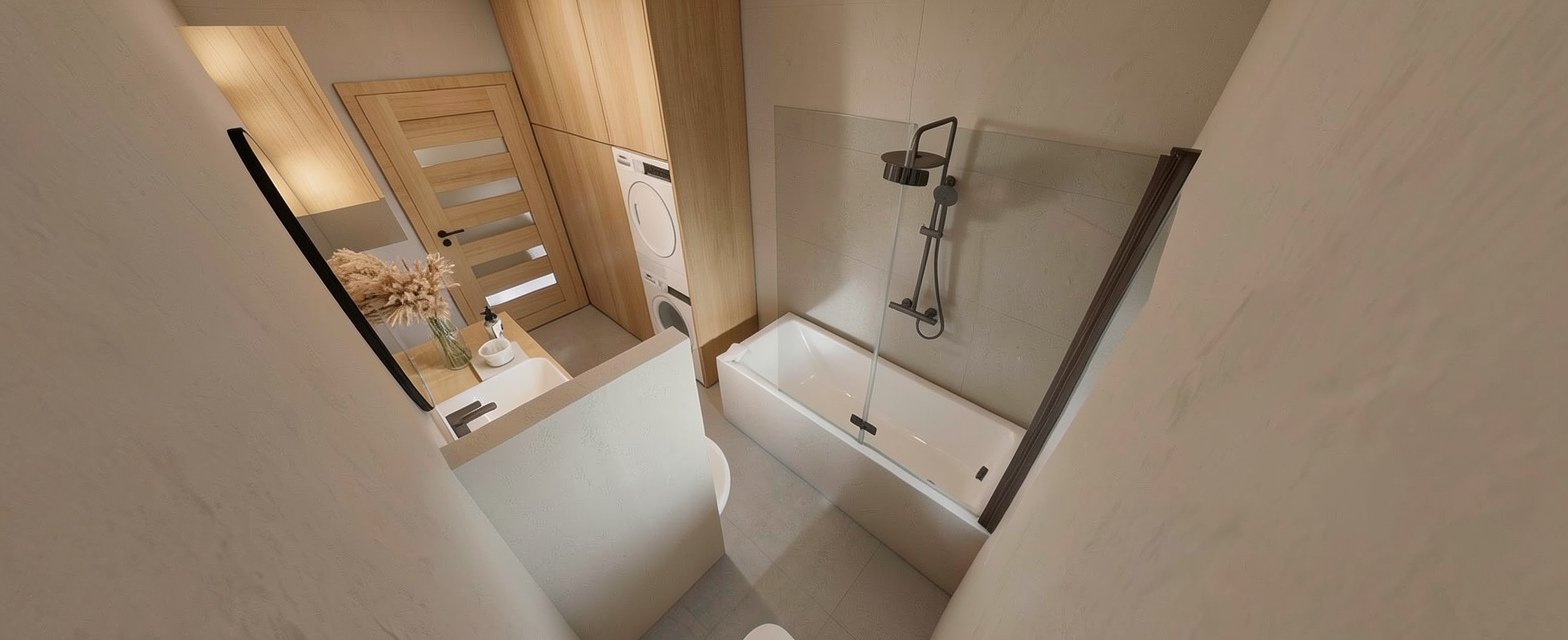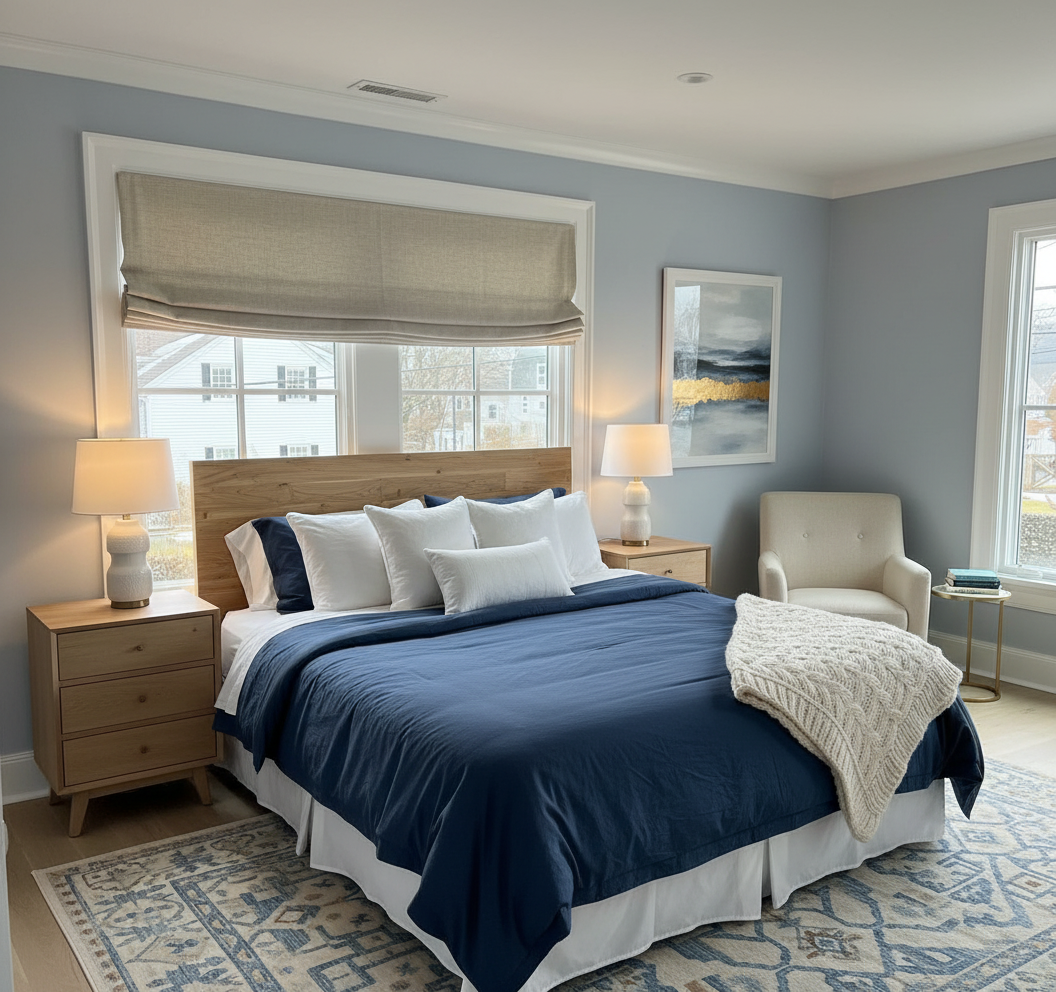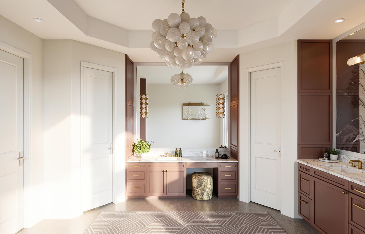 stucco building with gray clay shingles south florida style light green storm shutters for windows with landscaping and palm trees around and a golf course in the background
