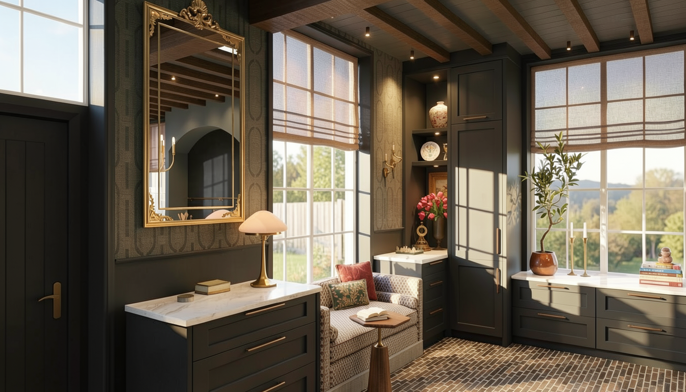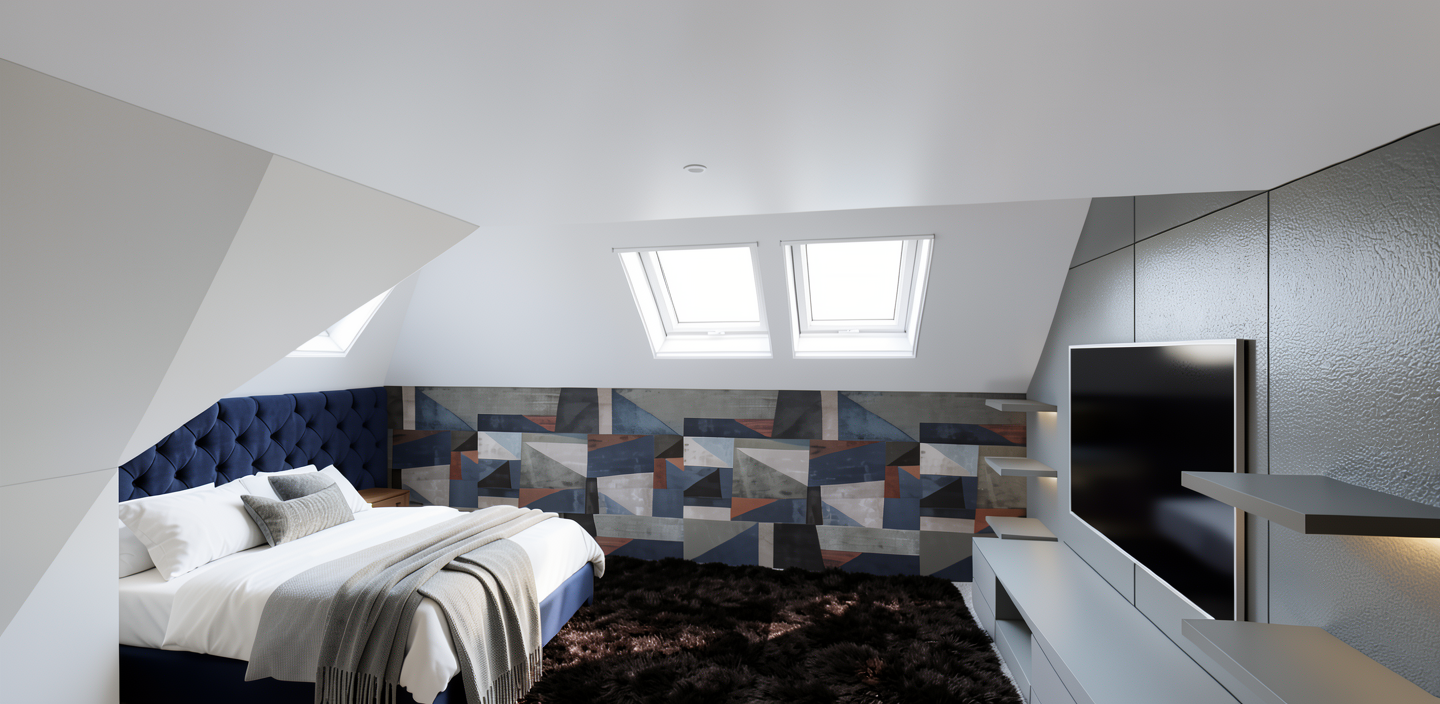 keep absolutely everything in this image exactly the same velux skylights white ceiling light grey carpet dressed bed with white bedding dark navy tufted headboard geometric abstract wallpaper on the vertical wall tv wall unit dresser cabinet room layout and all proportions do not change anything except the rug change only the rug two adjustments 1 size make the rug even smaller than it currently is the rug width should be the same width as the bed only it should not extend beyond the sides of the bed at all it should protrude only from the foot of the bed extending forward by approximately 600 700mm roughly the width of the two velux windows visible above as a scale reference the rug should look like a neat contained runner style rectangle sitting squarely at the foot of the bed small and tidy 2 colour change to a warm burnt orange colour like terracotta rust orange much more orange than brown think of the vivid orange terracotta copper tones visible in the geometric wallpaper panels on the wall behind the pile remains dense plush shaggy long pile texture photorealistic luxury interior sharp details