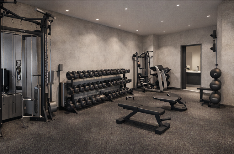 remove bench press and reflect with beige yoga mats