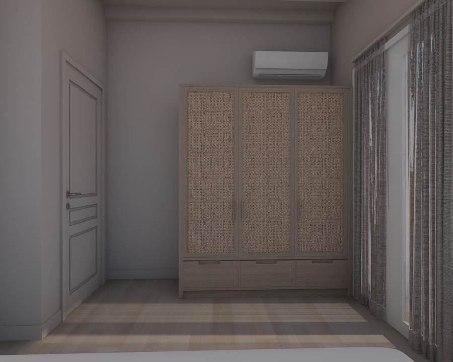 create a highly realistic render of a natural interior the wardrope has a frame of champagne oak light wood and has a wallpaper of rattan the curtains are white keep the initial design off white walls