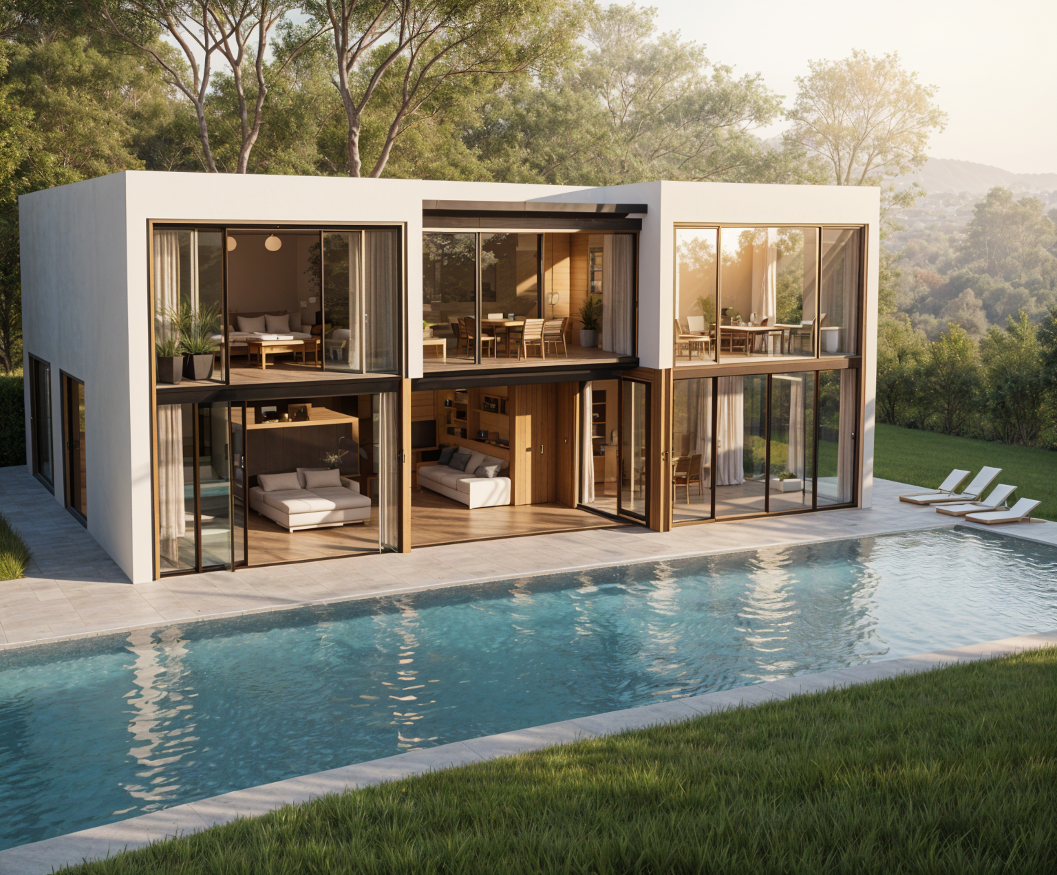 photorealistic exterior render of a modern tropical farmhouse based on the given floor plan layout use a warm contemporary design style with flat roofs clean geometric forms and natural textures like stone teak wood and white plaster integrate lush greenery tropical plants and soft landscaping around the house include cozy lounge furniture and natural lighting with golden hour sunlight highlight reflections in glass and water for realism surrounding atmosphere calm luxurious and nature connected inspired by a modern bali farmhouse aesthetic ar 16 9 v 6 style photorealistic quality 2 chaos 10