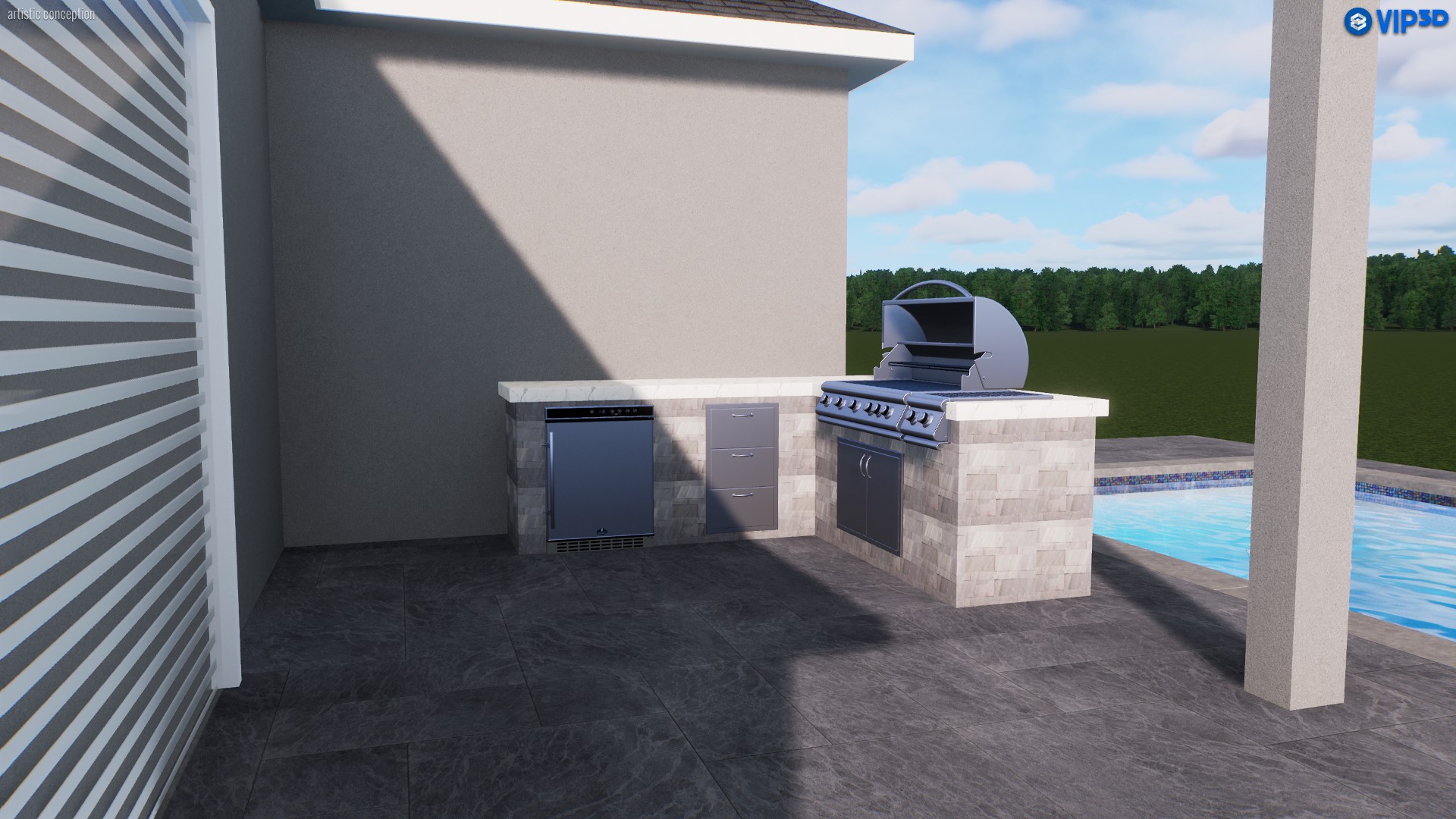 make this outdoor kitchen design look like a real photo and add a black aluminum dinind set