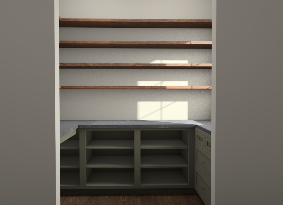 create a hyper realistic image from this pantry rendering cabinets are a muted fern green countertops and backsplash are soapstone wooded view through the windows with sunlight streaming in do not alter the cabinet layout or details reclaimed wood shelves in the pantry add pantry items to shelves