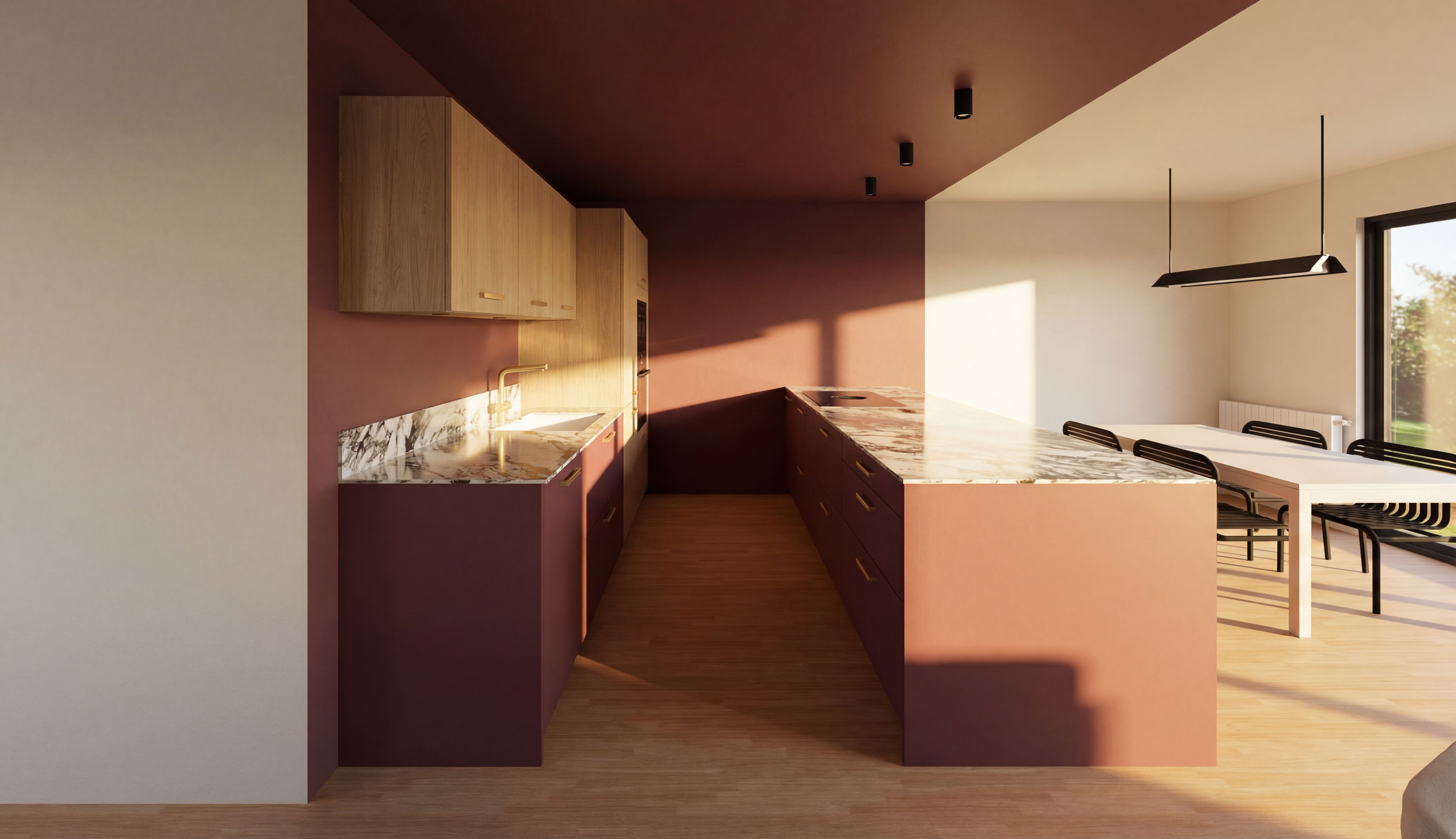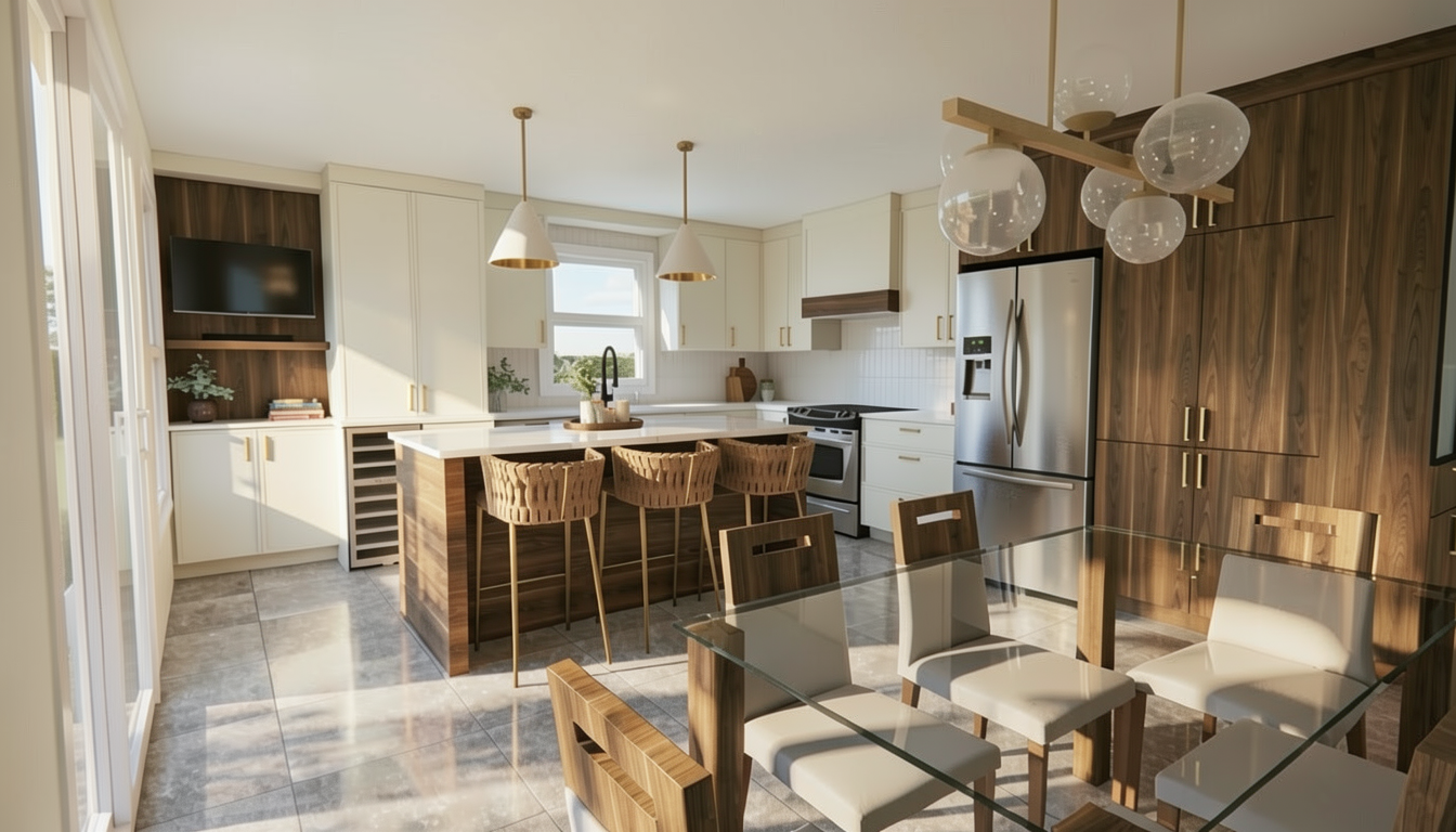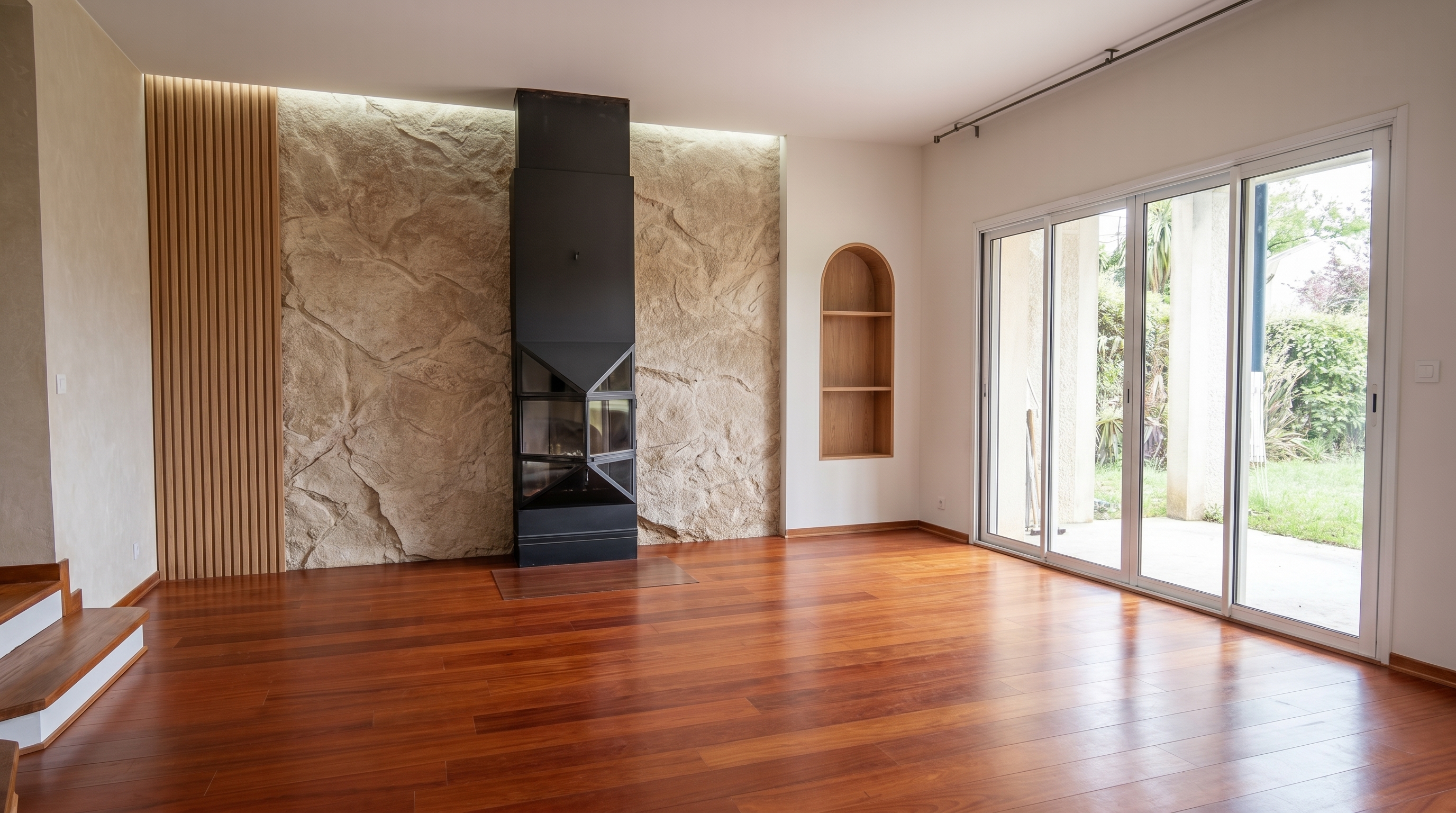 modernist exterior shot refurnish the room as a contemporary high end living room with a warm and elegant atmosphere use a palette of wood and beige tones natural materials and soft lighting place the tv on the left wall architecture