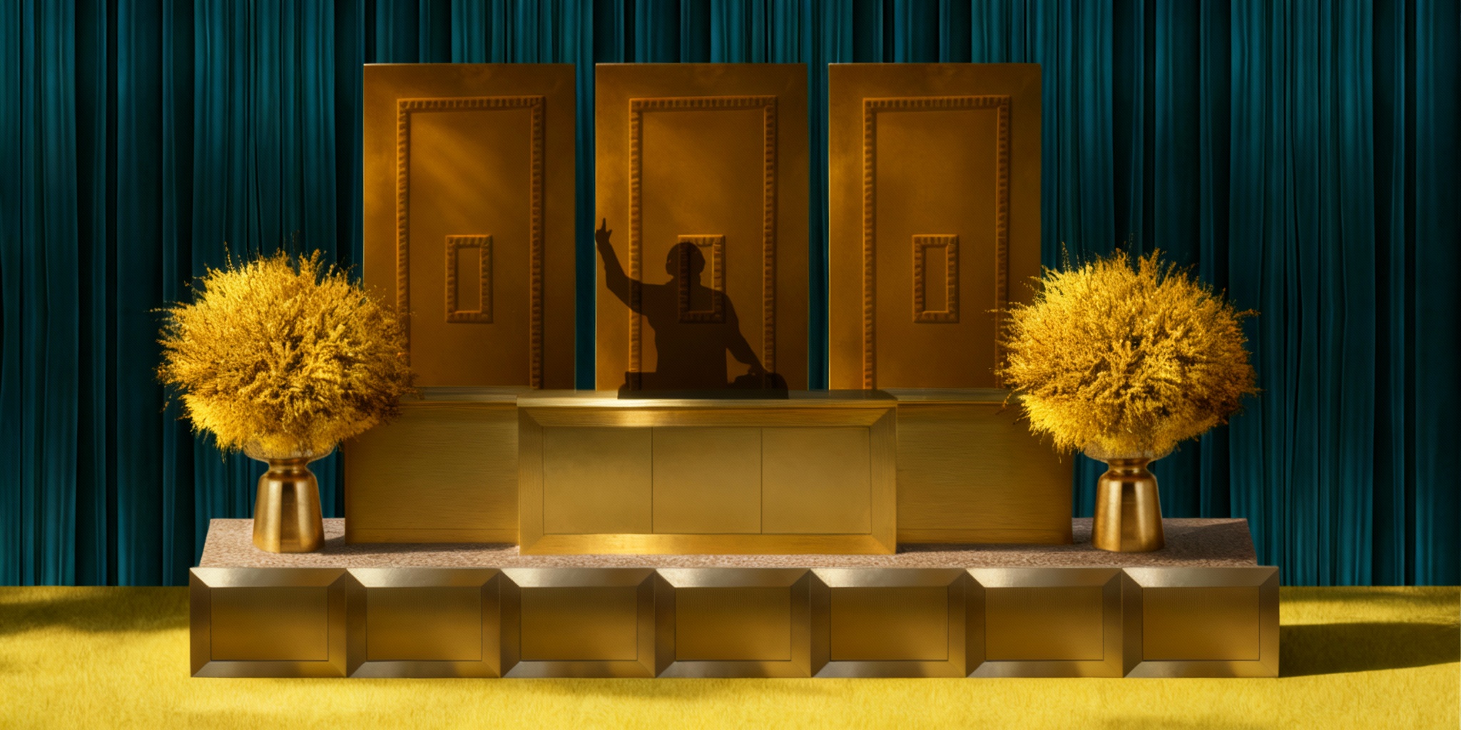 these exact furniture pieces lamps in a dimly lit room with this carpet and this drapery on wall architecture