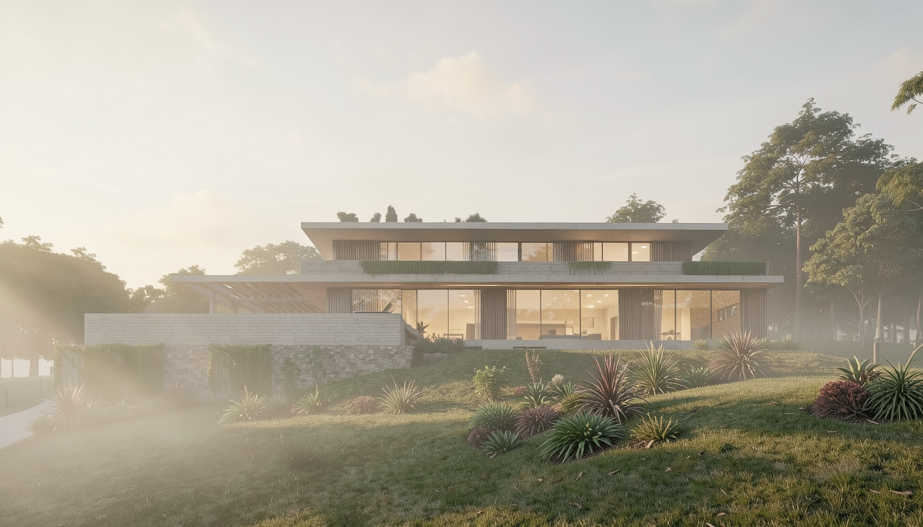 photorealistic architectural rendering of a contemporary australian rural home enhancing an existing lumion base image introduce soft atmospheric depth abundant natural light with a warm low angle sun early morning or late afternoon creating gentle highlights and soft shadows refine materiality to feel tactile and true to life timber with visible grain and tonal variation stone with natural irregularity and depth metal with subtle reflectivity and imperfections glazing with realistic reflections and slight interior transparencyadd understated warm interior lighting 2700k 3000k to create a soft glow from ensuring it feels natural and not overexposed balance interior and exterior lighting so neither dominates enhance landscaping with slight movement and realism softened edges and subtle tonal variation in grasses and foliage introduce light environmental effects e g faint haze diffused background to increase depth and atmosphere overall mood should be warm calm and evocative slightly ethereal but grounded in realism avoid overly dramatic contrast or stylisation aim for a premium architectural photography aesthetic with a cinematic softness