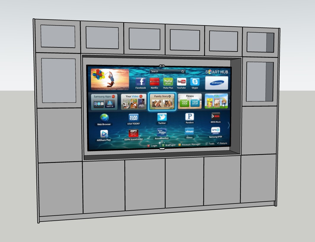 this is a tv unit finished in a light grey it is fitted between two walls in a stylish sitting room