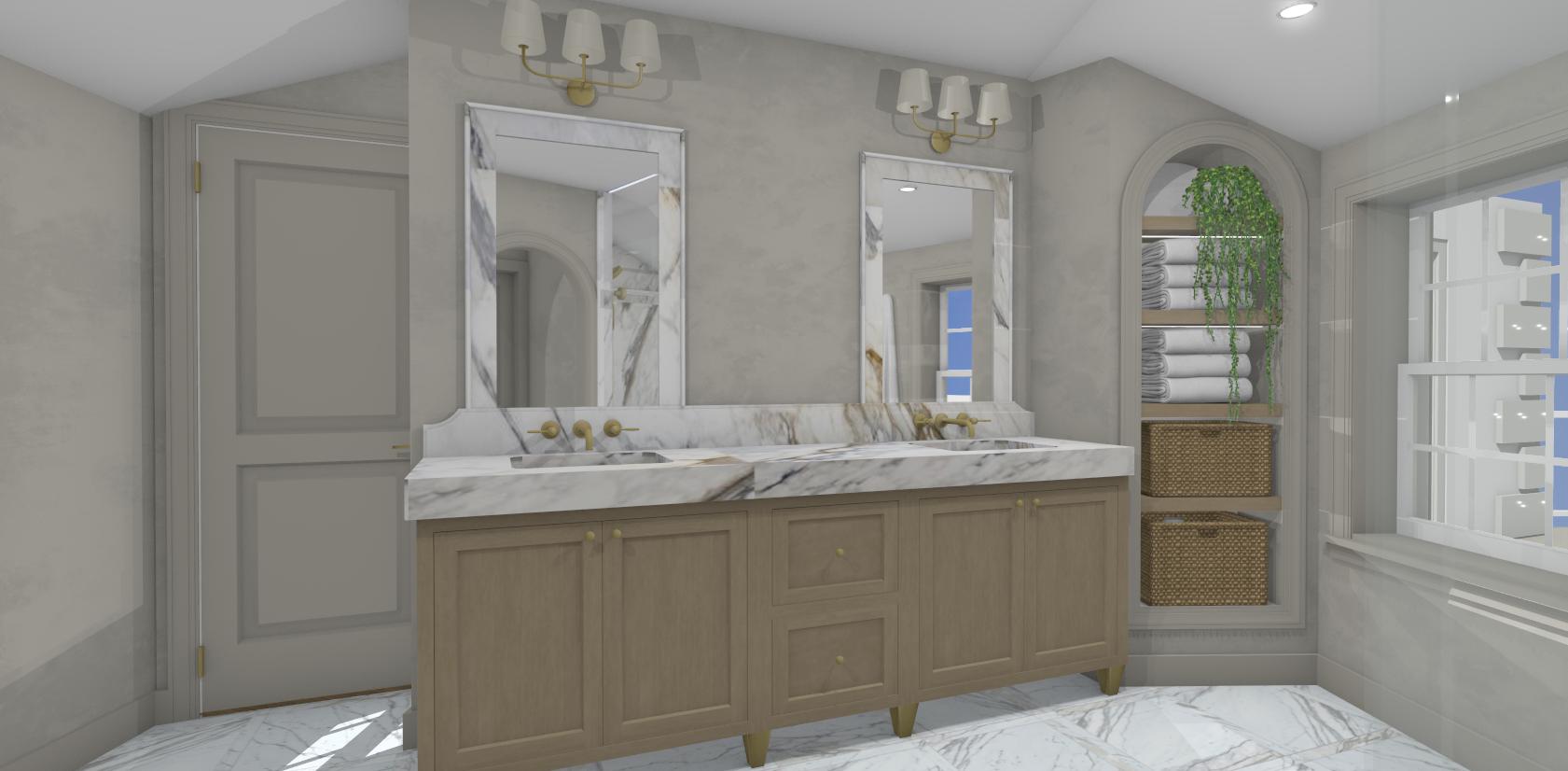 the vanity cabinetry should be shown in a rift cut white oak wood with a light stain color all marble shown should be in a honed finish please do not change any materials or any architecture shown in the image