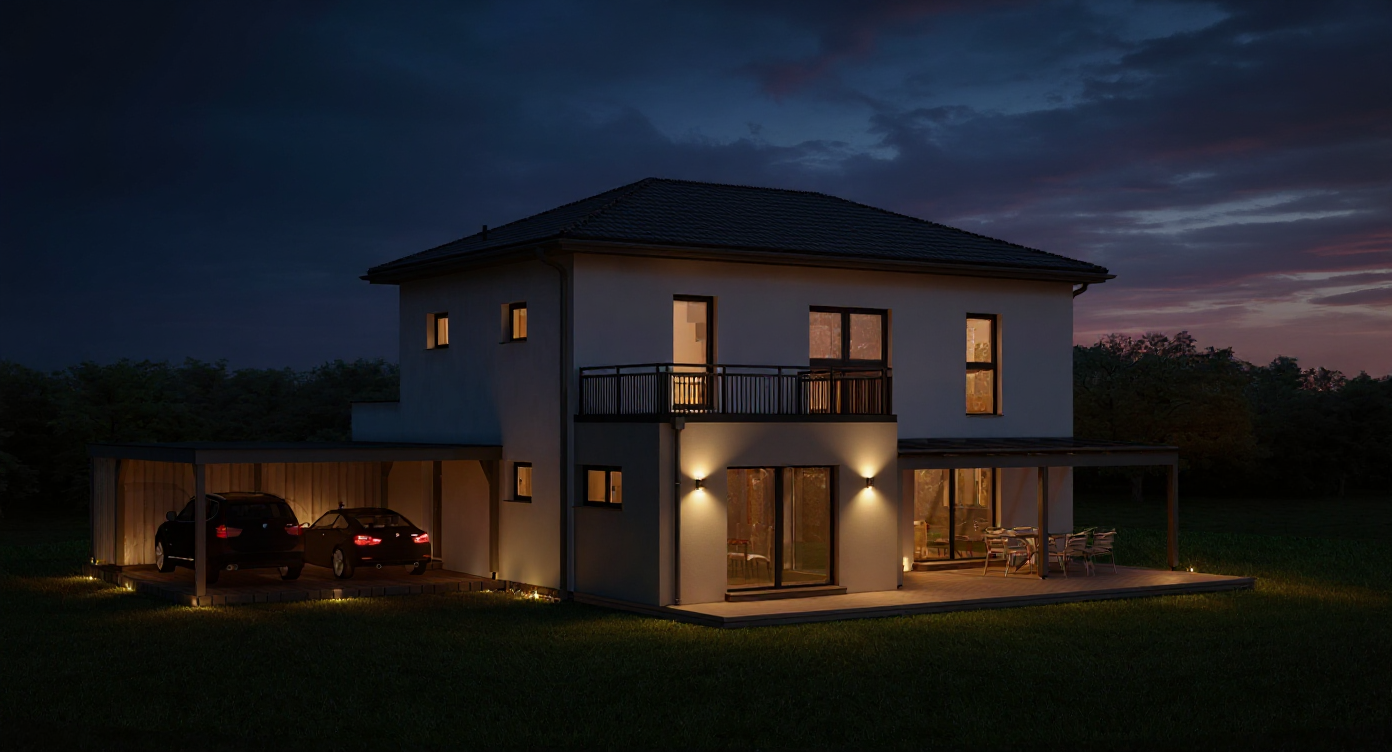brown roof white paint dark brown brick trees behind