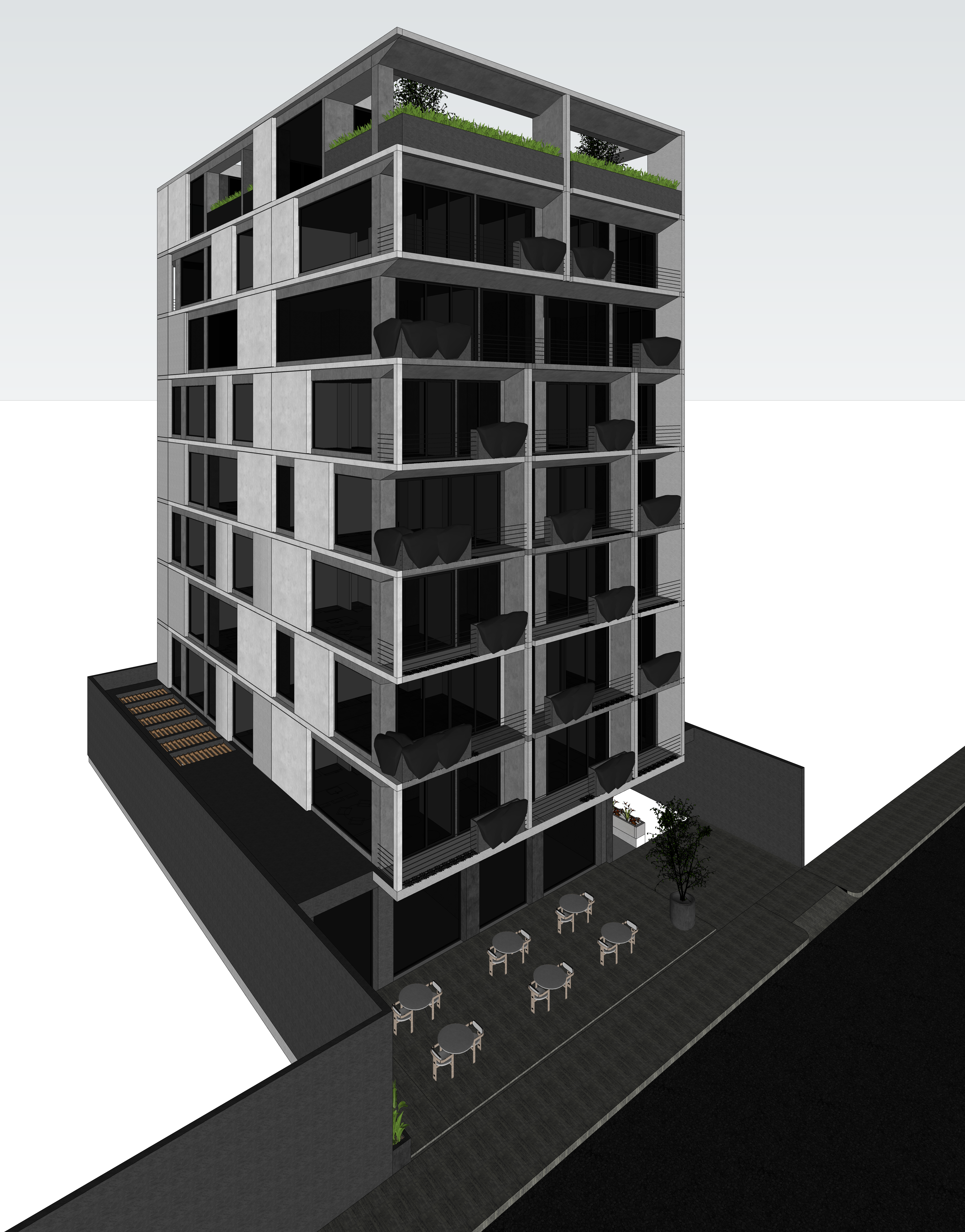 exterior shot exterior shot stunning urban street scene featuring a modern sleek apartment building the building has a minimalist gray facade accented by dark reflective glass windows vertical planters host lush greenery cascading softly from each balcony adjacent a classic brick building adds contrast with warm red and brown tones the street below is bustling with life people casually walking a tree providing fresh greenery and a cafe with beige umbrellas and seating the ground has a neatly paved sidewalk next to a subtle stone wall the atmosphere is vibrant and contemporary filled with bright natural daylight that casts gentle shadows suggesting a peaceful sunny afternoon in the city architecture architecture