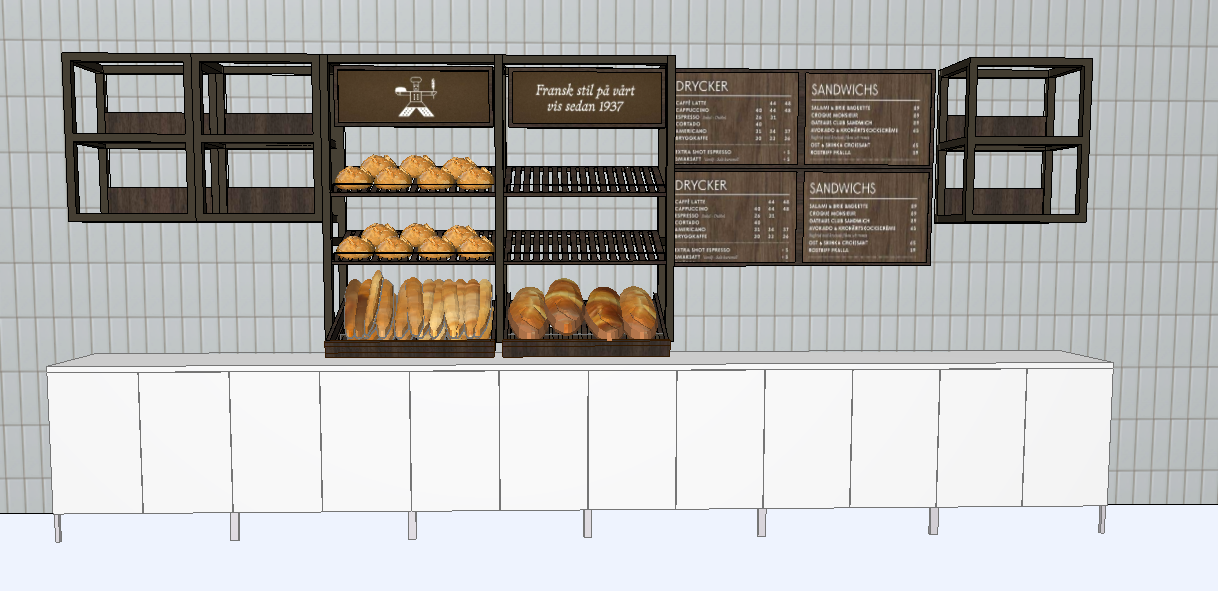 a cozy bakery display with freshly baked bread placed on rustic wooden shelves the breads are in shades of warm golden brown with a soft inviting texture the shelves are made of dark rich mahogany giving a classic and elegant feel on the wall there are menu boards with chalkboard style writing in white against a dark brown background the wall tiles are a subtle light gray providing a neutral backdrop the base counter is sleek with a clean white finish the atmosphere is warm welcoming and artisanal evoking a sense of comfort and quality soft ambient lighting bathes the scene in a gentle glow architecture