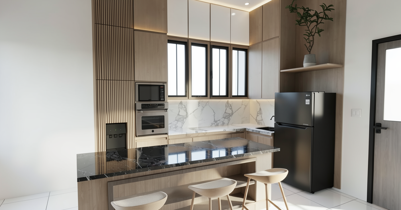 dont make changes to the model realistic architectural interior render of a modern minimalist kitchen with warm neutral tones l shaped kitchen layout with light wood grain cabinets and black frame accents upper cabinets with glass panel doors and soft integrated lighting white marble countertop and backsplash with subtle grey veining central kitchen island with matching marble surface and light wood paneling featuring a recessed shelf and three modern black bar stools built in stainless steel oven and microwave integrated into tall cabinetry vertical wooden slat panel with a black water dispenser unit black double door refrigerator placed on the right side near the corner sink minimalist black faucet and compact sink set into the marble countertop floating shelf above the refrigerator with a decorative potted plant large door with black frame and frosted glass panel on the right clean modern interior scandinavian japanese inspired design soft natural daylight illumination subtle ambient shadows realistic materials high detail textures photorealistic architectural visualization global illumination soft reflections ultra realistic render