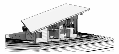 the home is located at 11 500 feet above sea level in colorado it s spring and there are wildflowers in the field surrounding the home it s sunset and there are scattered clouds in the sky all of the exterior walls of the house are clad with a horizontal black shou sugi ban siding the exposed wood decks roof soffit and structural framing are natural wood and are stained a dark brown the railings are powder coated black the windows are reflective with a very light blue tint