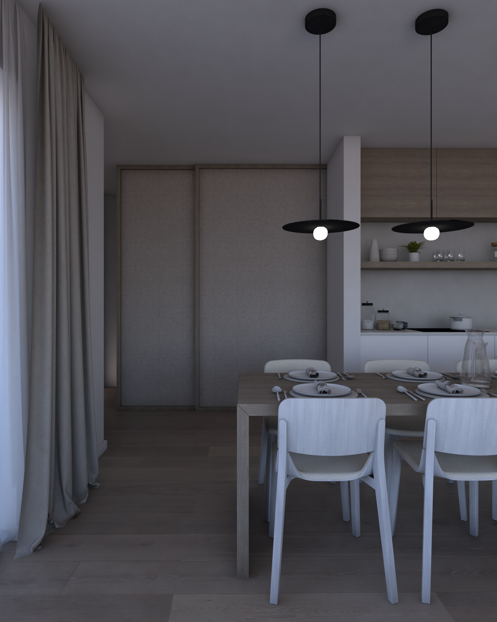 photorealistic interior soft light do not change the material design do not add any elements kitchen shelf backlit