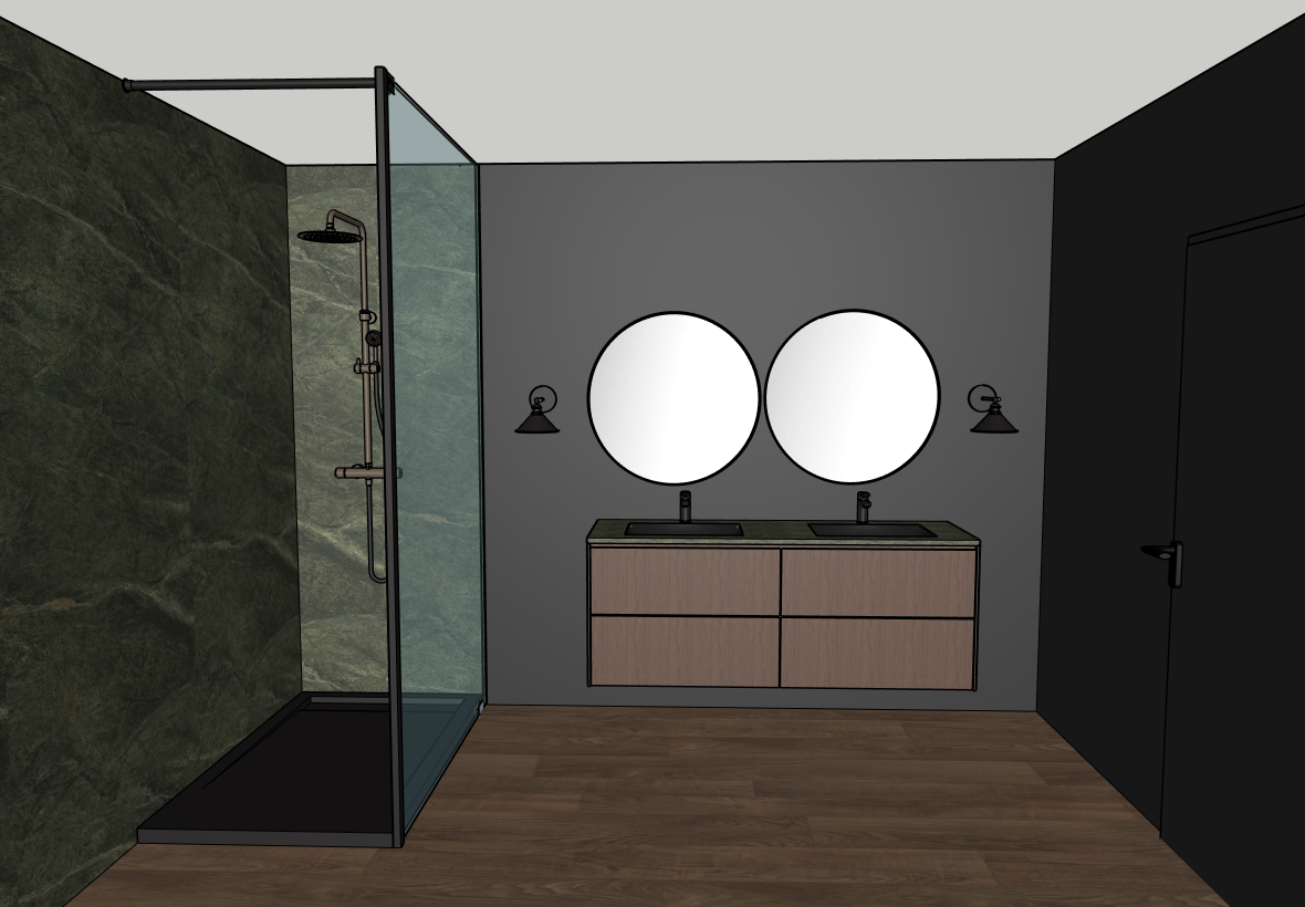 a modern minimalist bathroom with a luxurious atmosphere the shower features a glass enclosure and a rain style showerhead set against a deep green marble wall the double vanity has dark wooden cabinetry with a green stone countertop complementing the sleek black fixtures walls are a rich charcoal gray black while the lighting creates a warm inviting ambiance the floor is made of rich brown hardwood adding warmth and texture two round mirrors above the sink add elegance the overall feel is serene and sophisticated with balanced natural tones and modern design elements with no window