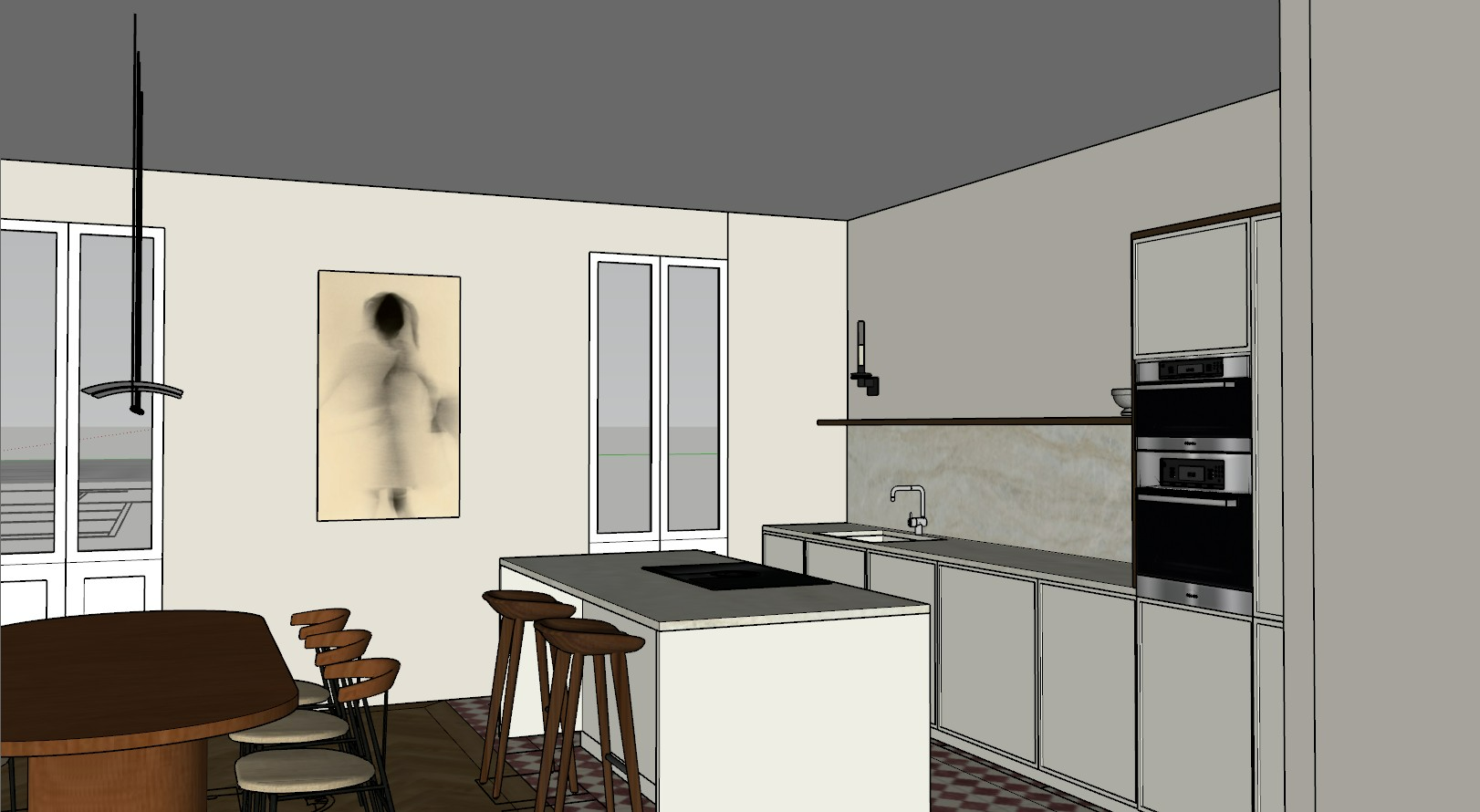 mantain precise materials and colors turn on warm lights and make walls a bit more beige add a eixample building from barcelona in the window view
