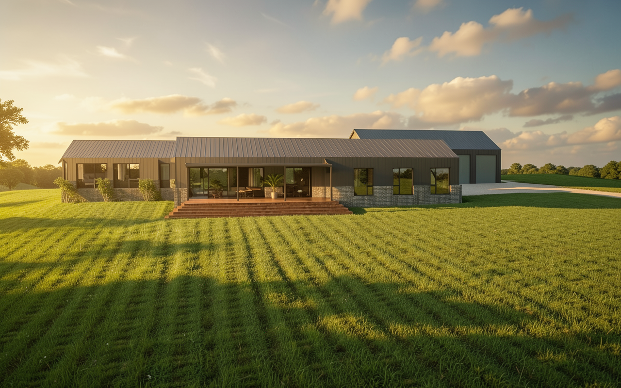 a manicured lawn lots of australian eucalyptus trees in the background and the foreground australian native ferns and plants and native shrubs and native plants stone pathway leading to the entrance an outdoor kitchen entertaining area to the left front with a sloped roof and a pathway to a square firepit 2 children playing more large native australian eucalyptus trees everywhere wallaby a small swimming pool close to entertaining area and bikini girl