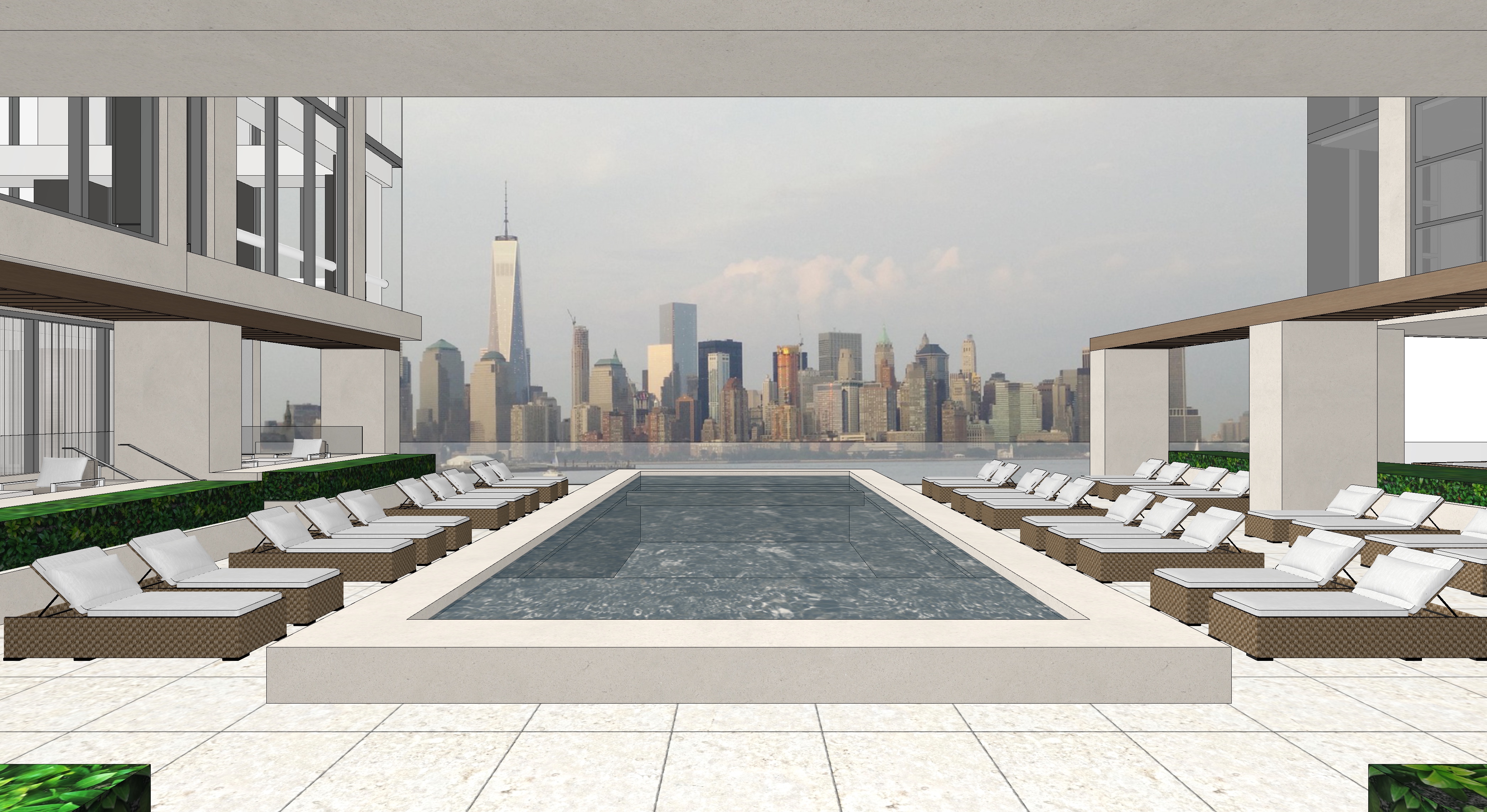 render a modern rooftop terrace with a luxurious swimming pool use serene blue tones for the pool water and warm beige for the surrounding tiles feature elegant white loungers with rattan frames incorporate lush green hedges to add natural vibrancy the building facade should have a sleek light gray finish with large glass windows that reflect the sky the atmosphere should feel tranquil inviting and sophisticated with soft lighting and shadows to enhance the overall ambiance dusk lighting light under the edge of the pool and inside the water light up the skyline view