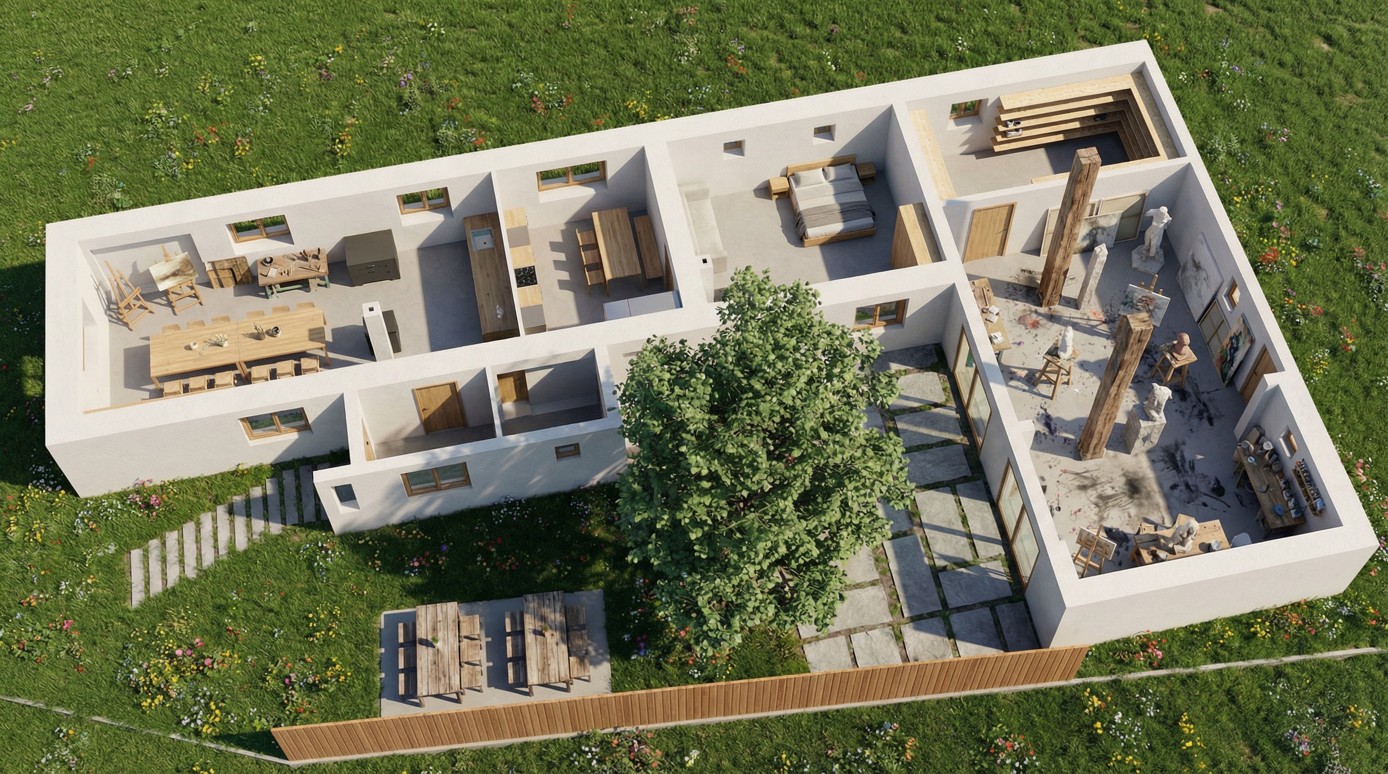 transform into a high end hyper realistic visualisation keep the view the same same walls same window do not make floors shiny matte cream stone floors add detailed textures and reflections add large jute rug under coffee table add tall shrubs outside window on left side low afternoon sun