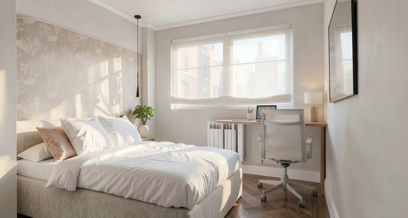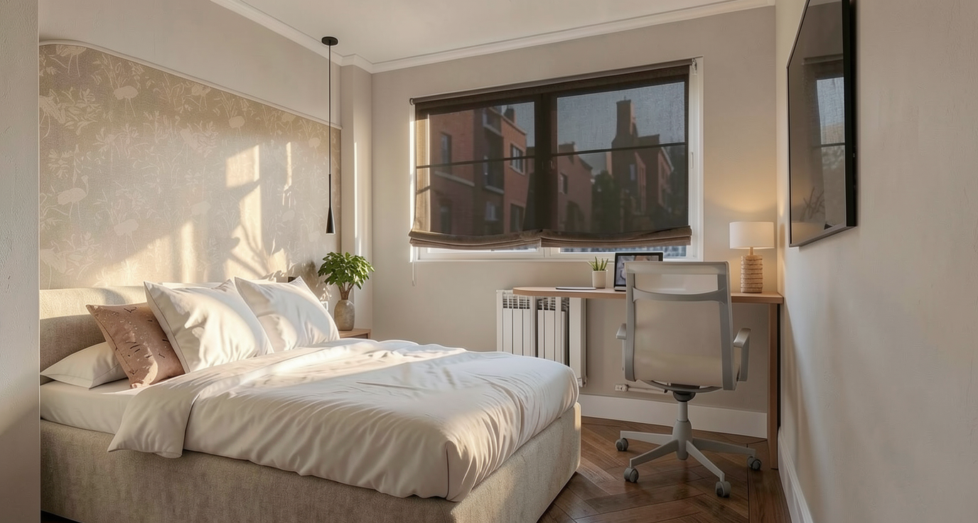 exterior shot render a modern kitchen with an elegant and cozy atmosphere use soft sage green for the cabinetry and island and a glossy charcoal gray for the countertops creating a sleek contrast include copper fixtures for the sink and wine cooler for a touch of warmth the flooring should be a smooth dark gray to complement the overall tone add skylights for natural light with a calm neutral gray ceiling and walls maintain an inviting and contemporary vibe with balanced lighting and refined textures