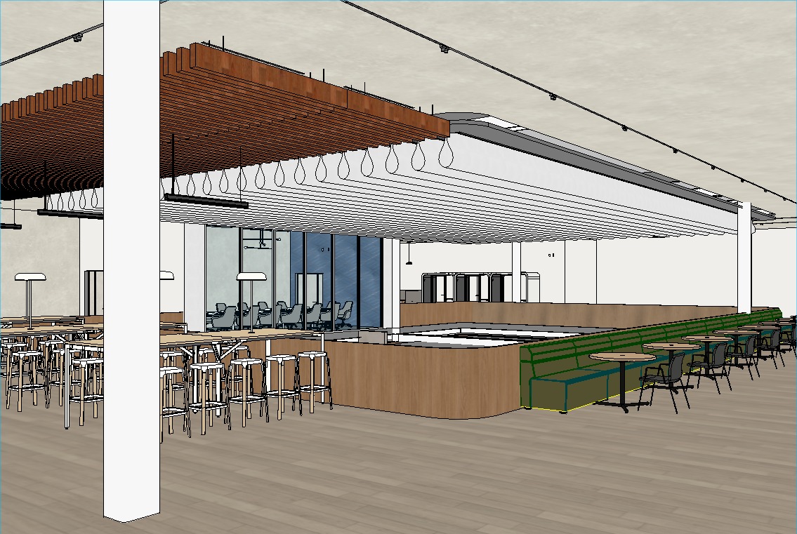 photorealistic interior render of a modern millerknoll showroom maintain exact layout proportions furniture placement and geometry as provided scene features a double height space with a central custom wood shelving display wall showcasing designer furniture pieces chairs and lighting objects symmetrical composition with two round white work tables in the foreground surrounded by white ergonomic office chairs and blue upholstered stools ceiling composed of linear wooden slats with integrated lighting between slats light wood flooring throughout built in millwork in warm oak tones framing the display background includes additional showroom areas with furniture visible but softly out of focus materials must be highly realistic natural oak wood matte finish visible grain white lacquered tables and chairs soft reflection upholstered fabric stools deep blue textured fabric neutral painted walls warm off white glass and metal details subtle and refined lighting soft diffused architectural lighting at 3500k integrated linear lighting in ceiling slats balanced ambient illumination no dramatic shadows even professional showroom lighting camera eye level perspective centered composition wide angle lens 24 28mm slight depth of field style ultra realistic high end interior photography similar to professional architectural photography photorealistic interior architectural rendering of a contemporary hospitality cafeteria space preserving the exact camera angle layout proportions ceiling composition millwork geometry furniture placement and architectural design from the reference image do not redesign or reinterpret the space the ceiling must be rendered exactly as designed and clearly differentiated by material and system 1 main ceiling smooth painted gypsum board drywall ceiling in a clean matte off white finish keep it minimal flat and uniform no decorative coffered ceiling no extra bulkheads no additional floating elements unless already visible in the model 2 white suspended ceiling feature the long white linear overhead element is made of suspended acoustic ceiling panels acoustic baffles read as an acoustic treatment system not decorative wood slats crisp clean evenly spaced white acoustic panels with a matte sound absorbing finish maintain the exact spacing rhythm depth and alignment shown in the model do not thicken curve or reshape these elements 3 wood ceiling feature the brown suspended ceiling zone is a separate acoustic wood slat acoustic wood panel feature in a warm medium walnut tone keep the slats thin linear and evenly spaced with realistic wood grain maintain the exact rectangular boundary and suspended appearance shown do not change its size or convert it into random wood beams 4 lighting use black linear track lighting mounted directly to the drywall ceiling tracks should be subtle modern and minimal with small adjustable heads as shown in the model keep the track lighting layout exactly as designed add realistic warm 3000k light output with soft focused beams preserve the hanging teardrop pendant lights below the wood ceiling feature with soft warm glow and elegant decorative appearance do not add extra light fixtures recessed pot lights chandeliers or led strips unless already present materials and finishes large millwork counter and bar clad in light natural oak oak veneer with subtle vertical wood grain refined matte finish flooring in light natural wood or wood look planks with soft grain and realistic tonal variation banquette seating upholstered in rich muted green fabric or leather tailored and clean tables in warm wood tones with black metal bases keep walls neutral smooth and clean design intent high end modern hospitality interior elegant warm refined minimal and architectural emphasize material contrast between white acoustic ceiling panels walnut acoustic slats matte drywall ceiling black track lighting light oak millwork and green banquette seating rendering quality ultra realistic interior visualization portfolio quality soft natural daylight combined with warm artificial lighting balanced exposure realistic shadows subtle reflections believable material texture and sharp architectural definition maintain a clean professional look not overly staged important restrictions do not modify the architecture do not change the ceiling systems do not replace the acoustic panels with generic slats do not invent new lighting layouts do not alter furniture arrangement do not add people do not add decorative elements not shown in the model do not change the camera view or proportions