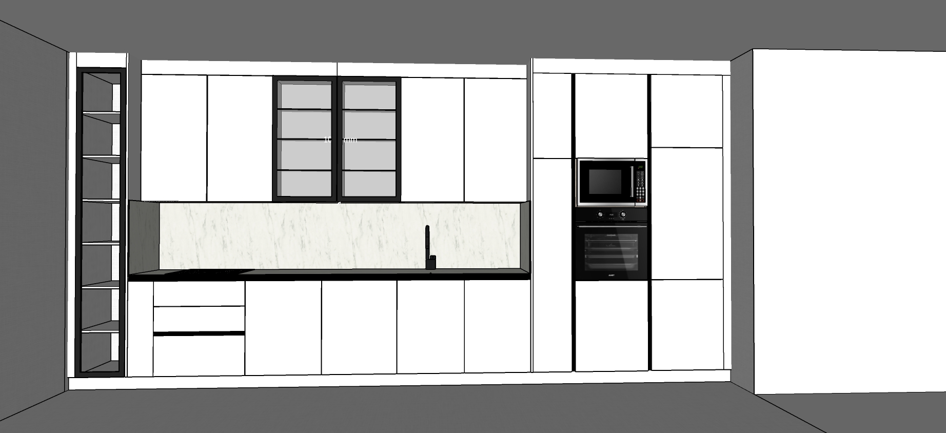 can you render this kitchen with white superr matte doors add led right and left in black glass doors and add a led under the upper cabinets add kitchen things on countertop