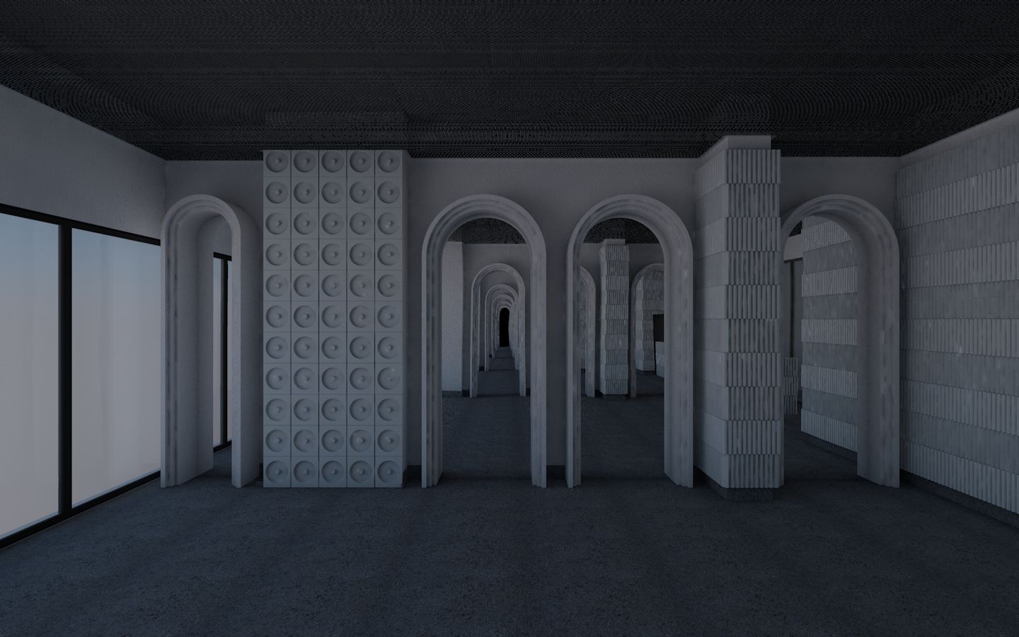 asta e shoromul artema cu obiecte printate 3d fa pardoseala de beton aparent lucios gri placarile de pe pere i cele cu linii alb cu negru si peretele cu cercuri fiecare cerc c te o culoare si nuan si textura diferit care iese din 3d print