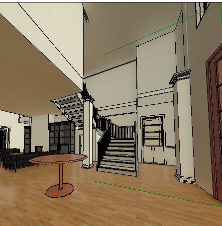 stained wood trim on uppers walls wood floors pointed arch between columns white columns colorful entry rug dusk sunlight from right side interior lights on