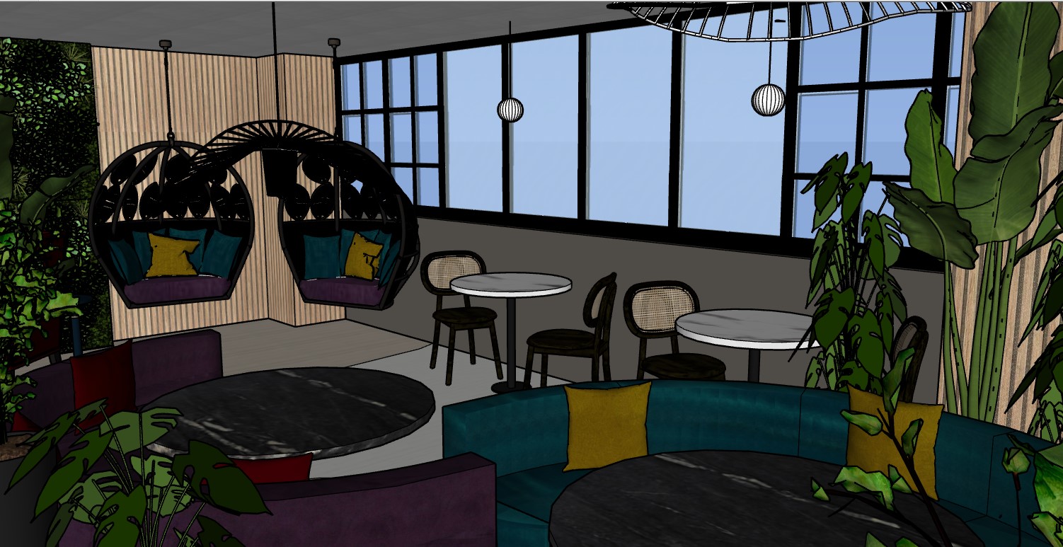 connect sofa ends raise the light higher in front of hanging chairs made the scene in the windows a college campus with high buildings add people sitting and drinking coffee happy