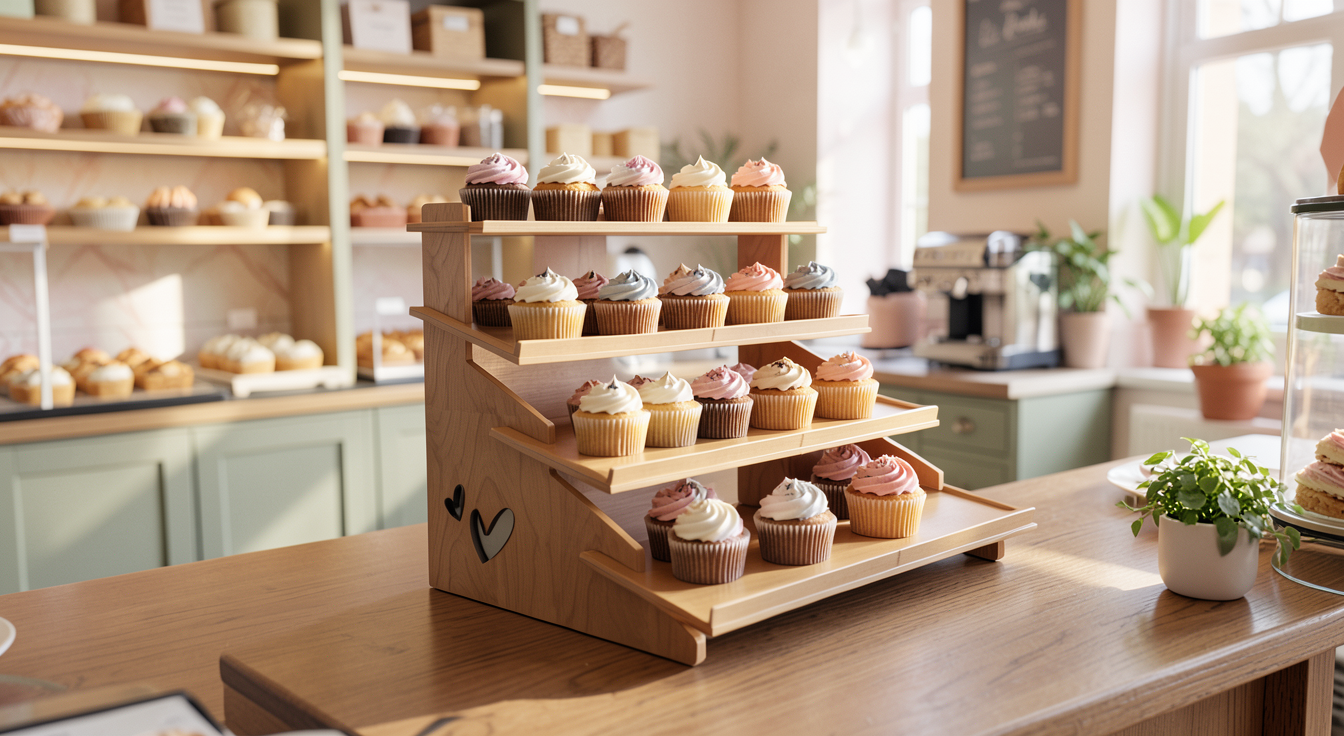 there are cupcakes on the stand a bakery image in the background with soft colors