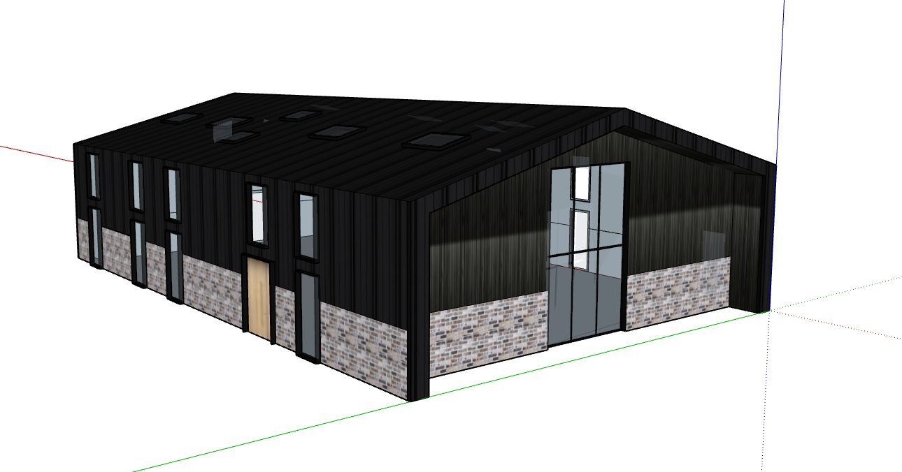 exterior shot a modern industrial building with a sleek design featuring a black standing seam metal roof and walls the lower portion is adorned with light reclaimed bricks consisting of reds creams and browns adding texture and contrast the windows are tall and narrow with reflective glass panes creating a spacious feel the door is made of light natural wood providing warmth and a welcoming entrance the atmosphere is serene and minimalist set under a soft overcast sky enhancing the building s elegant simplicity