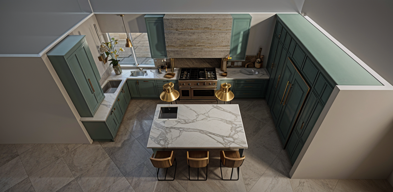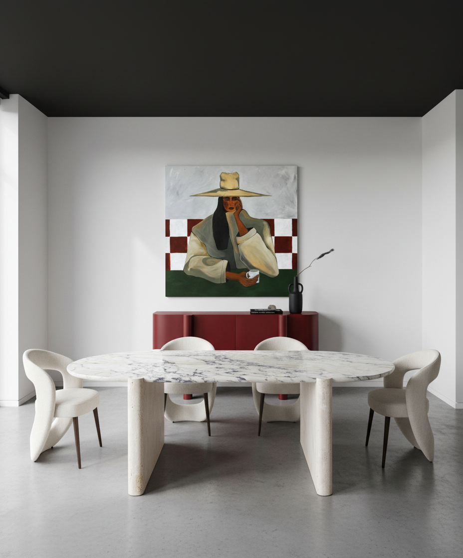 room floor is concrete walls are white ceiling is double height and black the dinning table top is calacatta viola marble the base is travertine put 4 dinning chairs make the buffet wider make the art work big add creative uplight light stand at the corner in burgnady and black