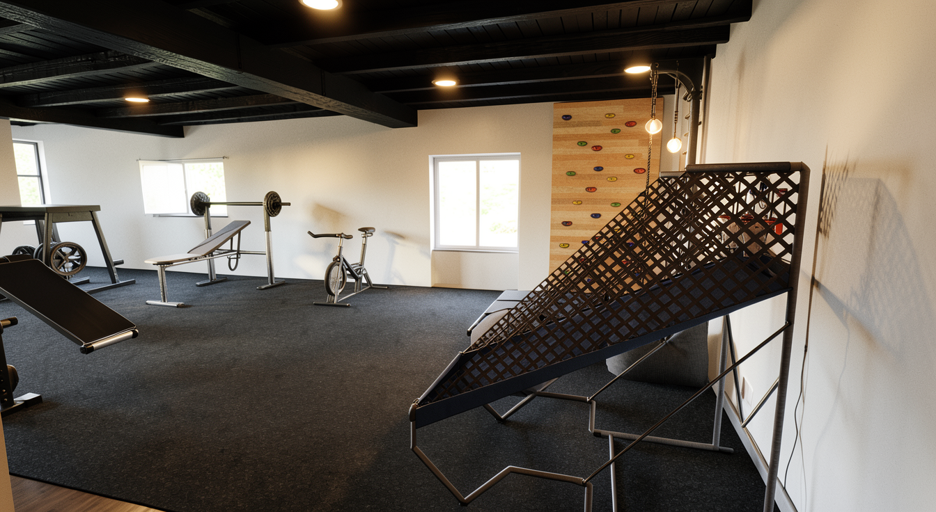 keep everything identical to the reference image do not change layout materials furniture lighting or camera angle update 3 stools at the table to be cylindrical shaped and fully upholstered speckled in taupe black and cream stools