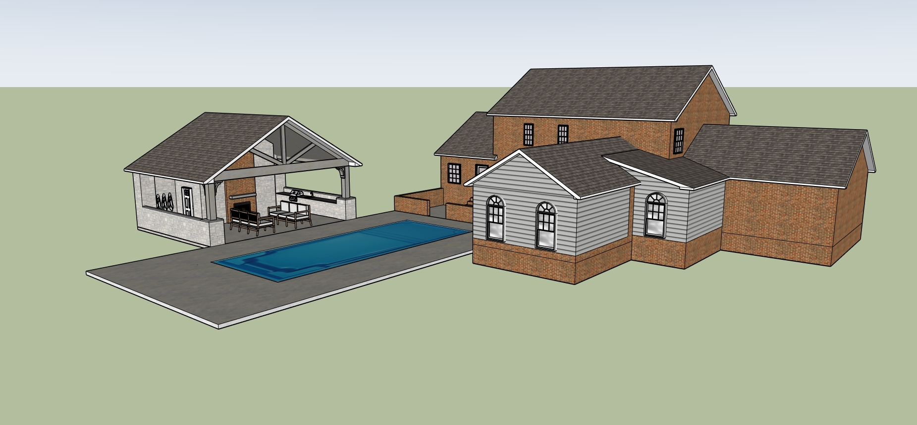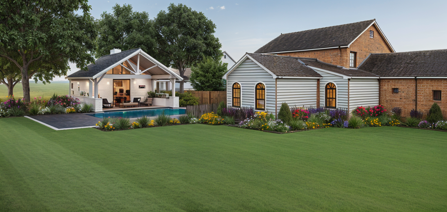 a manicured lawn layered flower beds low maintenance shrubs mature trees behind the pavillion house is in a neighborhood with a close neightbor behind them fireplace under pavillion white windows show driveway entering on right side
