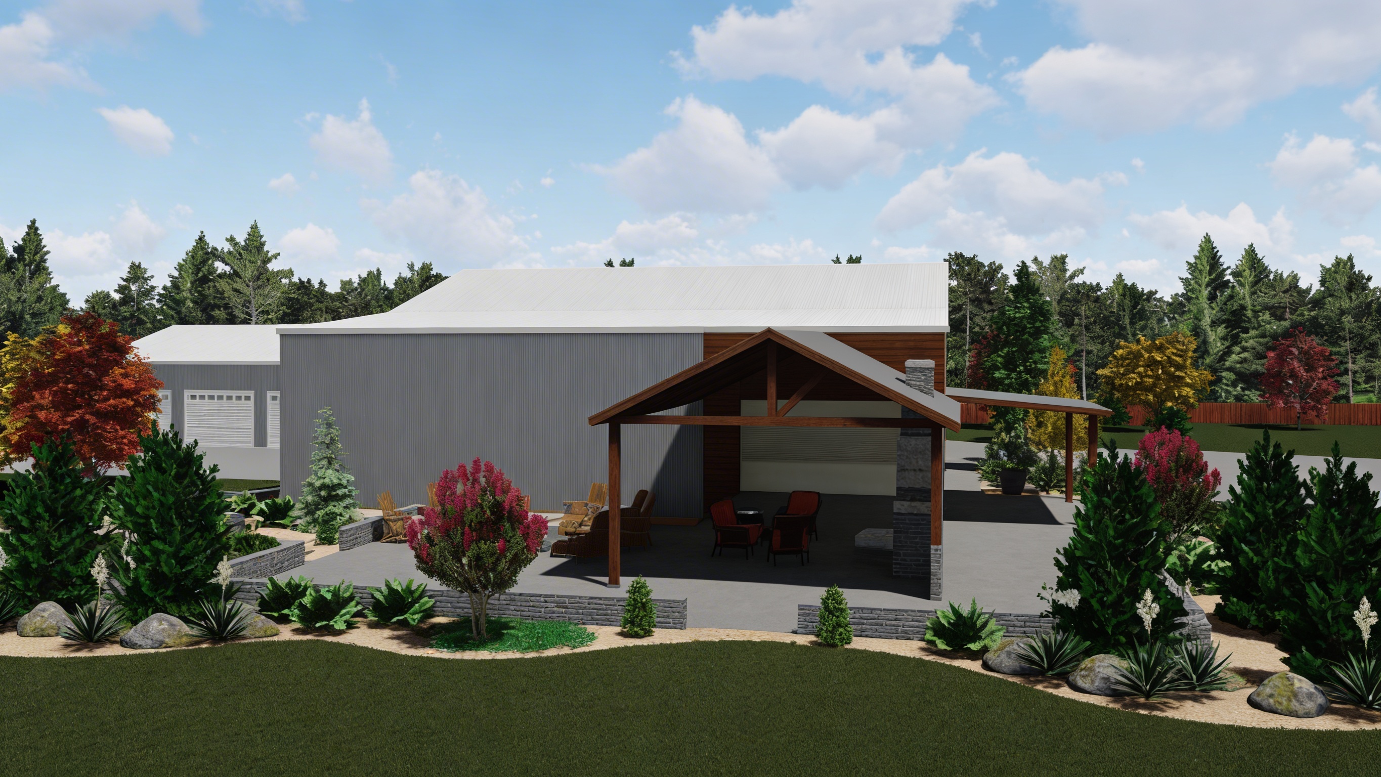 a modern architectural visualization of a small atelier house standing next to a larger main house in a lush green garden the landscape is dense with vegetation grass and mature trees the atelier house is positioned in front of a tree and blends naturally into the green surroundings the front facade of the atelier is made entirely of clear floor to ceiling glass creating a transparent and open appearance toward the back the building becomes closed with solid concrete walls the roof has an organic shape inspired by a leaf it is made of metal sheets that are weathered and covered with rust giving the building a natural and slightly industrial aesthetic the structure is modern and minimalistic with clean lines dark metal frames and a calm natural atmosphere soft daylight realistic architectural rendering high detail photorealistic modern architecture visualization