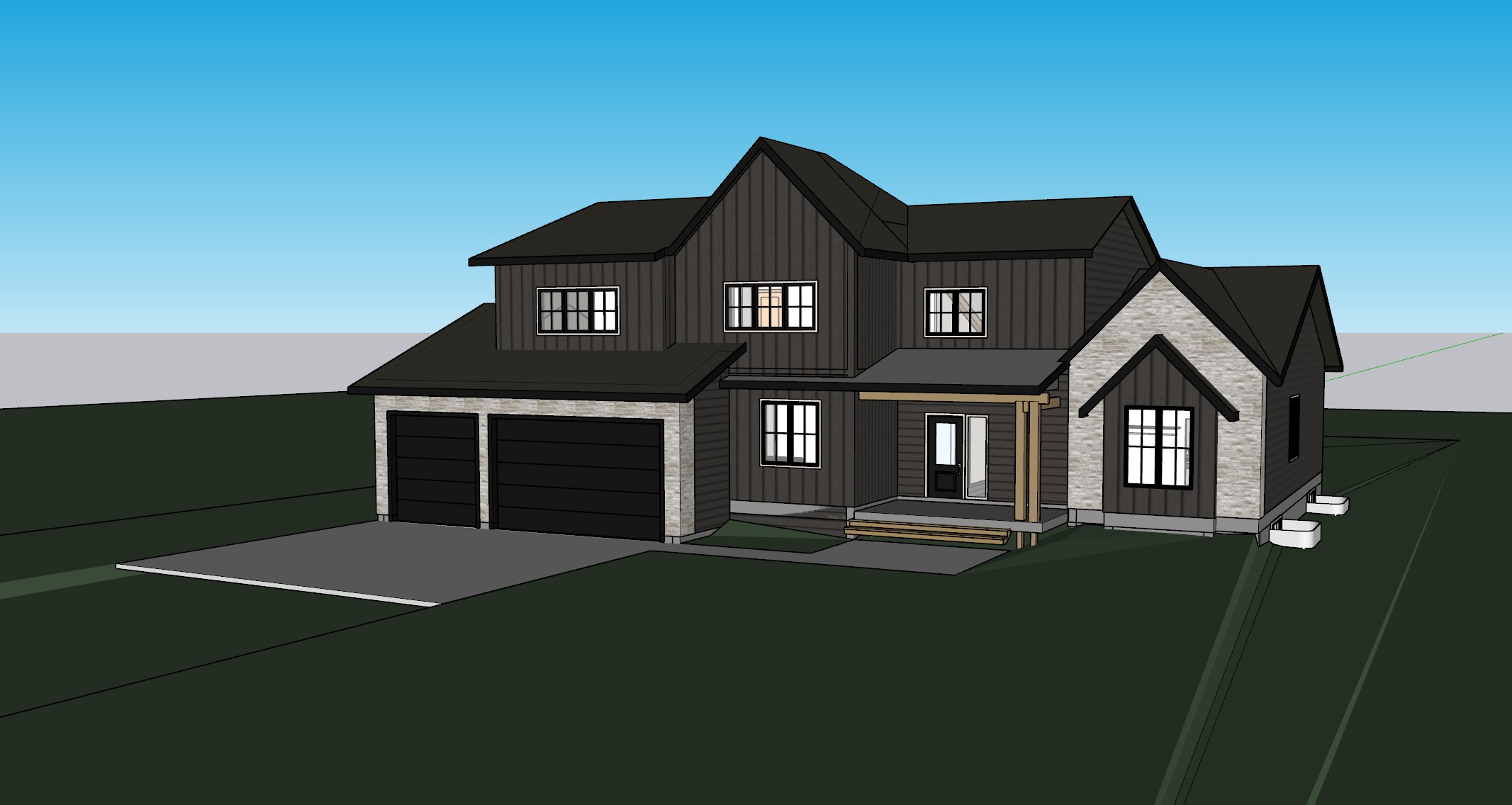 toned down spruce trees in back dark grey siding no sun all trim black