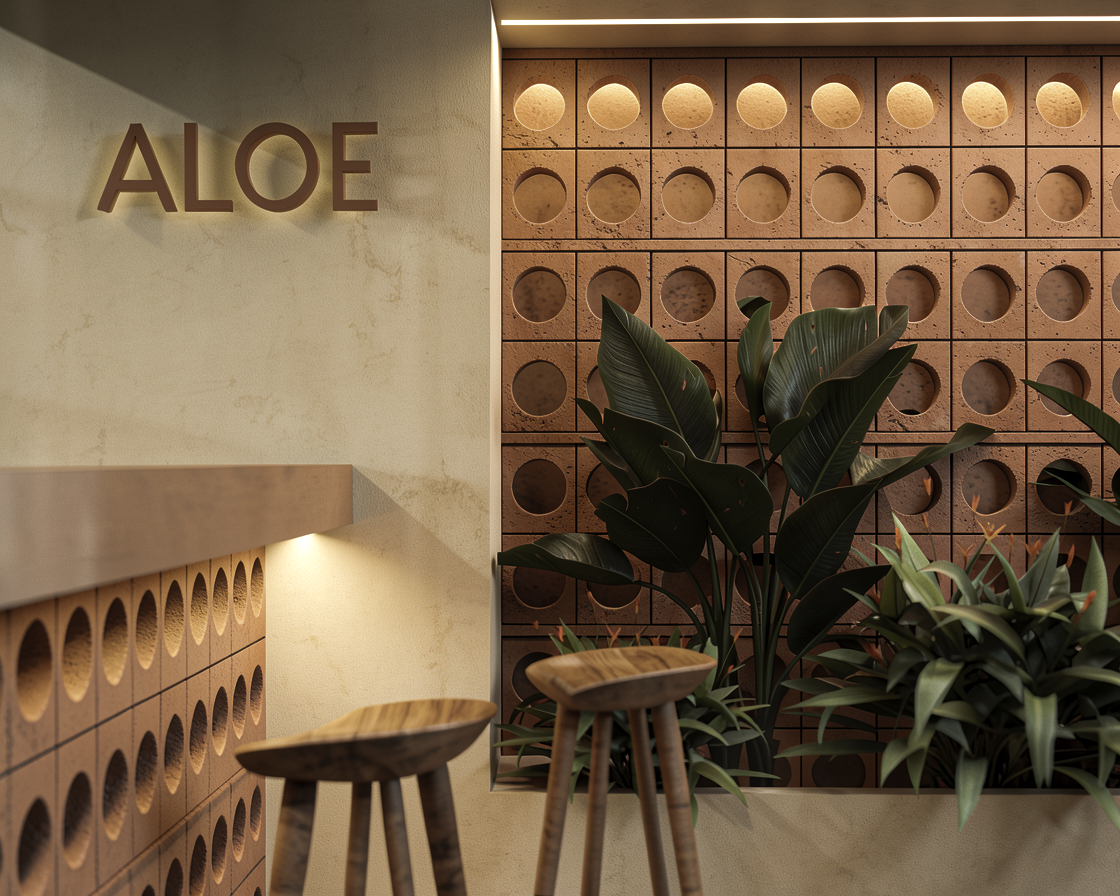 photorealistic edit of the input image strict constraints preserve exactly the original composition camera geometry objects and lighting setup do not redesign or move anything target modifications aloe sign remove the backlight glow completely the letters should remain as solid matte or satin brushed gold visible only through ambient lighting with no halo or emission walls and lattice material enhancement increase the perception of natural clay material across walls and lattice surfaces subtle micro porosity soft irregular texture very controlled slight tonal variation in warm clay beige spectrum matte light absorbing finish very light imperfections no dirt no stains the effect should be tactile and natural not exaggerated or rough lighting keep the original lighting direction and intensity do not add new lights only allow slight softening of highlights to improve material readability rendering ultra realistic physically accurate materials balanced and natural look negative prompt glow backlight emissive text overexposed highlights plastic surfaces flat walls grunge dirt heavy texture noise lighting change new shadows