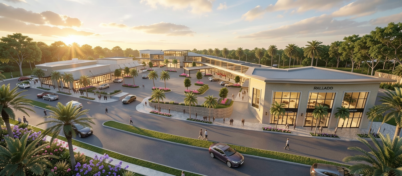 render an elegant shopping center with the same point of view and camera angle maintain building shape and details with a modern and vibrant atmosphere use large clear glass windows to reflect the surroundings the landscape features lush green palm trees and bushes with colorful purple and pink flowers lining the pathways cars in the parking lot and people walking throughout the roads are smooth asphalt with grassy green medians mixed with bushes and shrubs include a golden hour sky with a few clouds and soft warm sunlight casting gentle shadows creating a welcoming and lively ambiance trees in the background surrounding the buildings maintain camera angle