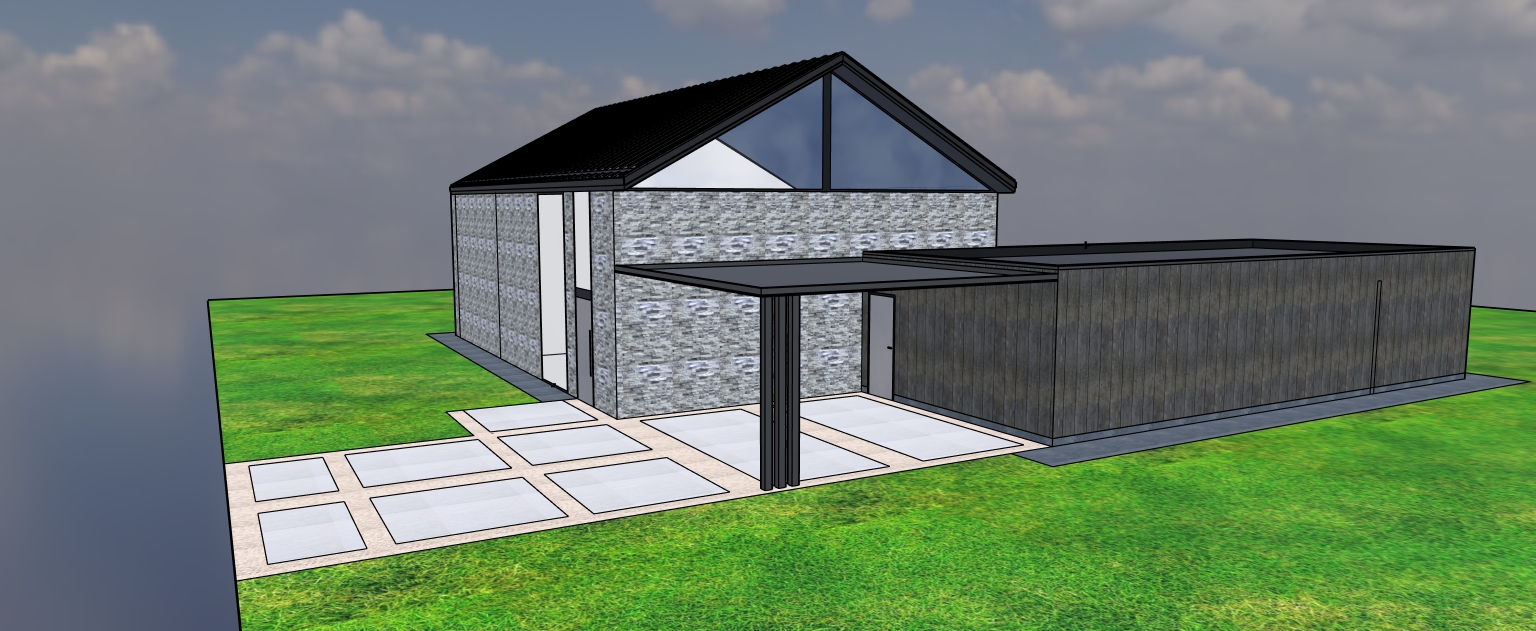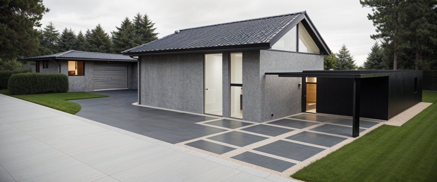 modernist exterior shot a modern house with a sleek design featuring textured gray brick walls and a black metal roof the adjoining structure has a dark wooden finish with a sleek contemporary look a driveway made of light gray stone tiles enhances the minimalist aesthetic the surrounding grassy lawn is a vibrant green adding a fresh natural element to the scene the sky is filled with soft fluffy clouds creating a calm and serene atmosphere with a gentle afternoon light illuminating the architecture architecture