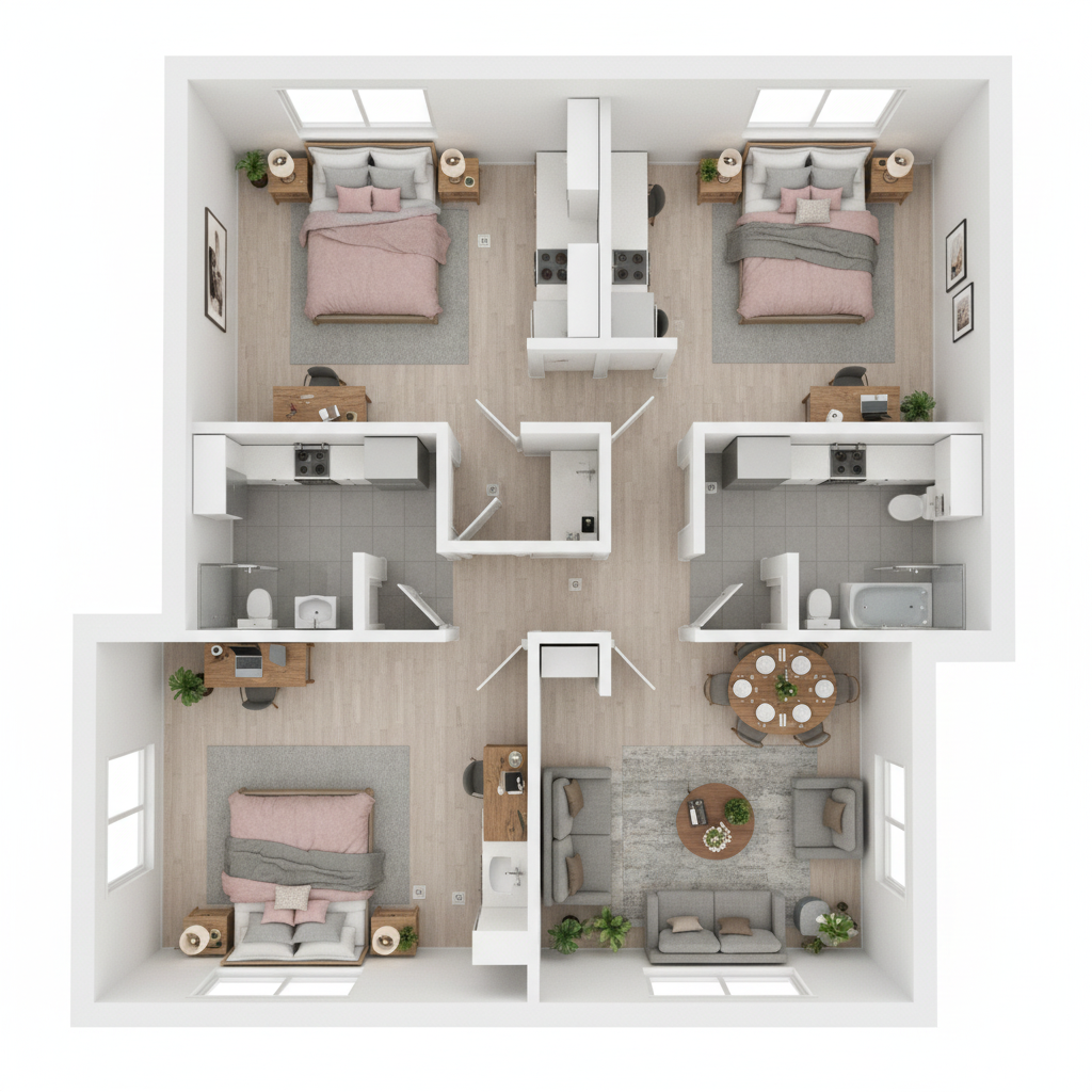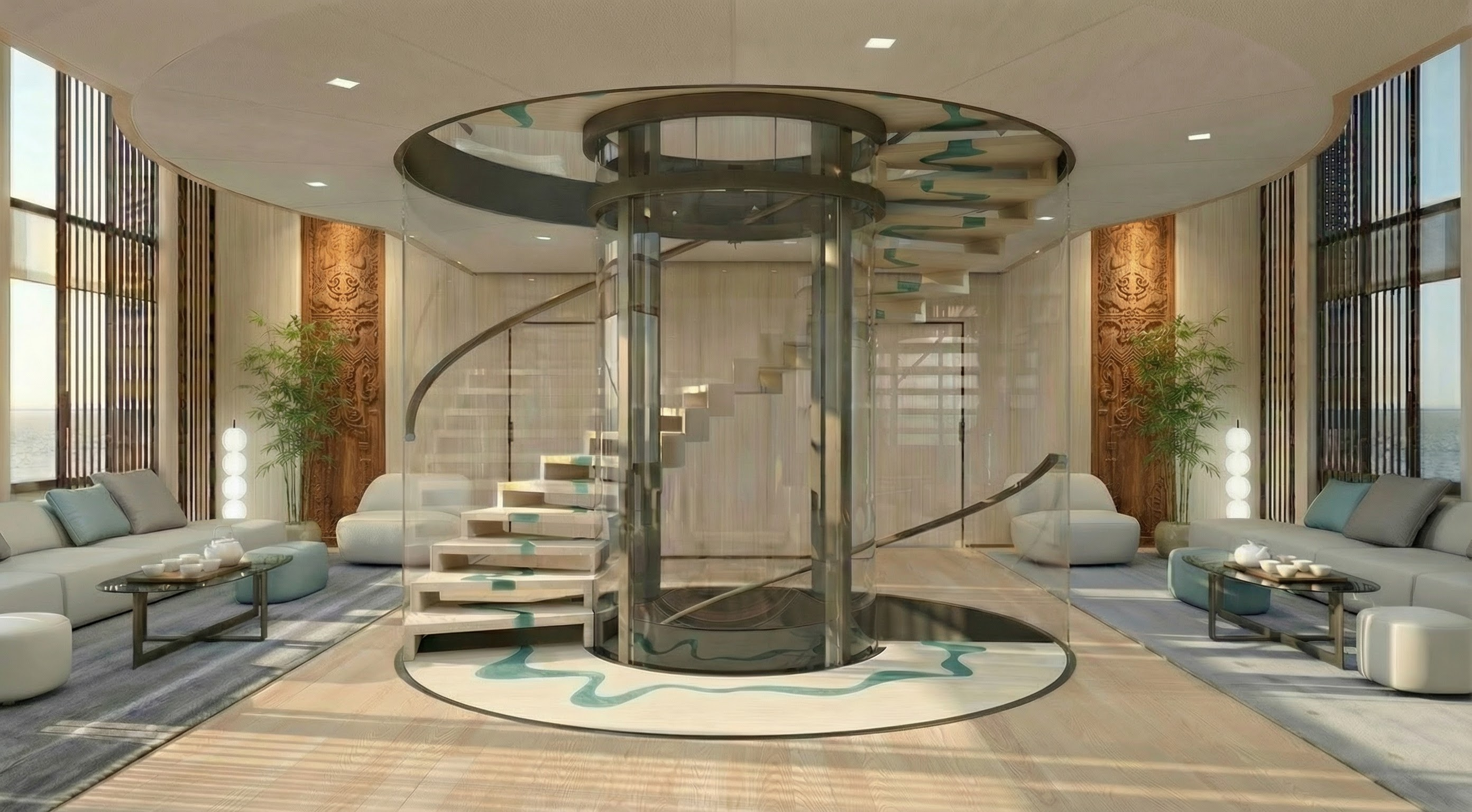 keep the entire scene unchanged except for the huanghuali panels in the two recessed vertical niches adjust the color tone of the huanghuali wood panels so that it matches the tone of the brise soleil wood in the scene the huanghuali should appear harmonious with the brise soleil color not darker or contrasting maintain the carved li brocade pattern and the continuous vertical relief from ceiling to floor do not modify any other material lighting or surface in the scene
