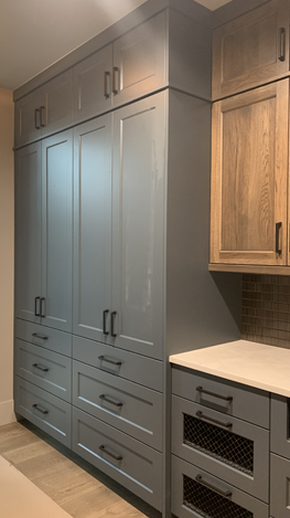 do not change the cabinets in any way preserve the exact cabinet colors materials finishes dimensions door and drawer styles hardware spacing alignment and all geometry exactly as shown do not alter the countertop shape backsplash appliances flooring lighting fixtures or wall structure only remove the construction materials clutter and mess from the scene clean the room and make it look finished and staged add a few simple tasteful home accessories appropriate for the style of the space but do not add or remove any furniture windows or architectural elements maintain the original lighting direction and realism enhance clarity and polish the photo while keeping the cabinetry and room design completely unchanged do not alter the lighting to keep the cabinet colors as they are in the image remove everything on the countertop stage for a beautiful kitchen turn the lights on add flooring